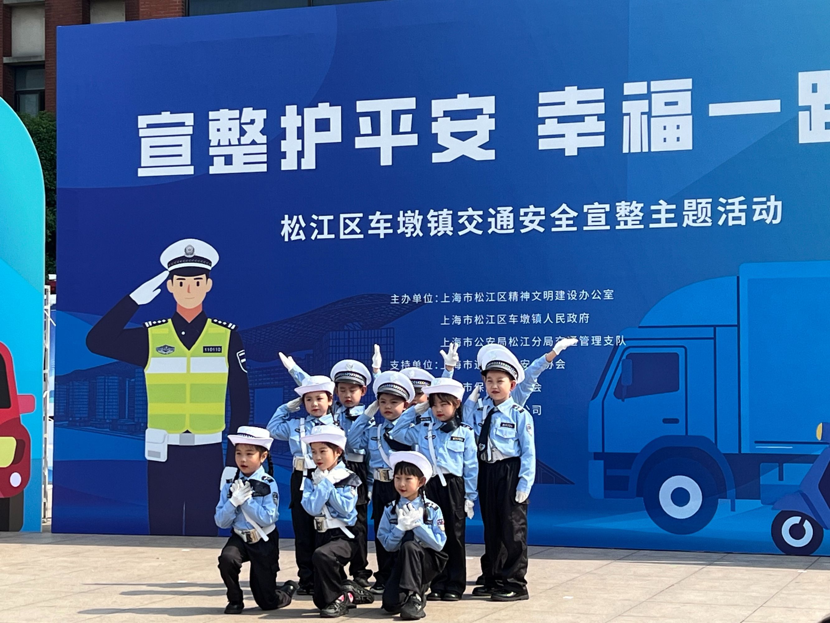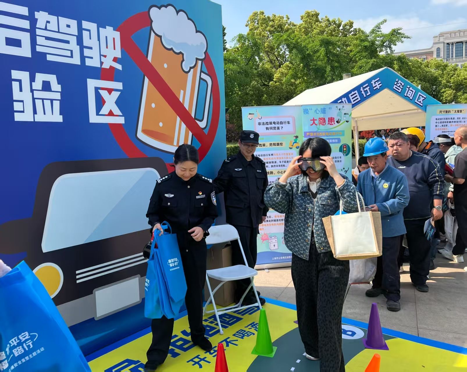 在车墩人口文化广场,“平安宣教大集市”热闹开场。幼儿园小朋友化身“小交警”,以唱跳形式展示由松江公安分局交管支队原创的童谣《童行安全诵》,演绎孩子们眼中的文明出行。现场设有酒驾体验站、交通知识问答、科技装备展示等互动项目,让大家在亲身体验中深化安全认知。