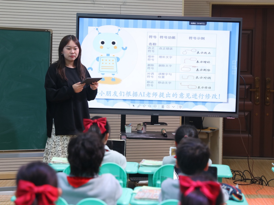 各学科积极探索AI技术与课堂教学的深度融合。语文组借助AI作文批改系统创新习作教学,显著提升批改效率,实现反馈更及时、指导更精准。数学组利用AI实时判题并提示典型错误,课堂互动更具针对性。英语组以AI赋能课堂教学,在锻炼学生语言表达能力的同时激发创作热情,推动语言学习与创意实践有机融合。综合组在“美味果茶诊断师”课程中,让学生通过平板调整果茶配方,系统实时生成分析报告,在实践中制作出更贴合自身口味的饮品。