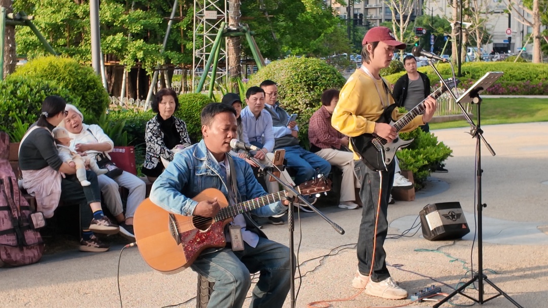 4月25日17时,中海真如环宇城MAX的银杏广场上,一缕吉他声悠扬响起。这是普陀区2026年新增街头艺人驻点后迎来的首场正式演出。 普陀新增中海真如环宇城MAX街头艺人点位 夕阳斜照,万物染金。魏磊和张继宏两位艺人一坐一站,怀抱吉他,弹唱起《恰似你的温柔》《爱就爱了》等经典曲目。沙砾质感的嗓音带着岁月沉淀的味道,在开阔的广场上缓缓铺陈开来。 街头艺人演绎 现场没有搭建舞台,也没有固定观众席,但音乐声一起,遛娃的家长、路过的白领、散步的老人便陆续停下脚步,围成松散的半圆。孩子们在音乐声中蹦跳摇摆,几位推着婴儿车的市民驻足聆听,有的拿出手机记录下这一画面。 年轻妈妈张菲菲抱着孩子驻足许久,孩子沉浸其中不愿离开,“他喜欢欢快一点的曲子,听到就会做动作。”周末来商场吃饭的市民骆泉则表示,在商场外听到这样现场弹唱,旁边都是遛娃、散步的人群,“太有生活气息了,打算分享给家人看看。” 市民围观表演 普陀区的街头艺人驻点演出背后有一套专业规范的管理机制。该项目由区文旅局委托上海市演出行业协会实施,所有上岗艺人均经过统一考核,持证合规演出。通过每周的统筹排班,街头艺人于周末时段到固定点位表演,形式以吉他弹唱、器乐演奏为主,每场约两小时。艺人自备音响设备和电源,无需搭建舞台,以轻量简约的形式呈现“小而美”的街头艺术。 上海街头艺人表演证 2025年5月起,该项目已覆盖区内上海长风大悦城、大洋晶典·天安千树、半马苏河公园等多个热门商圈与公园,获得了良好的社会反响。今年,为进一步深化文商旅联动发展,区文旅局新增中海真如环宇城MAX作为固定驻点,以文化内容激活商圈公共空间,进一步丰富文旅赋能消费的实践场景。今后每周末下午,街头艺人驻演将在此常态化开展。 中海真如环宇城MAX市场部负责人单诗琪介绍,银杏广场是项目外侧的公共空间,有古树和水景,是周边居民的日常游逛区域。引入街头艺人演出,可以延长顾客游逛时间,营造公共空间的文化氛围,丰富消费体验。她表示,商场正持续通过音乐演出、主题市集、面包节等活动,为商业空间注入文化活力,也为市民周末出行提供消费之外的多元选择。 街头艺人4月18日试演场景 在上海,街头艺人与城市的关系,正在这一处处小小的驻点中被重新定义。它打破了艺术场馆的物理边界,让文化服务融入市民日常生活——路过即遇见,停留即参与,真正实现“零门槛”的艺术触达。对商圈而言,音乐不只是背景声,它活化了公共空间,延长了人们在商业体中的停留意愿,为消费创造了更具温度和情感连接的场景。而对街头艺人这一群体来说,固定的驻点意味着更稳定的演出渠道和更持续的曝光,持证上岗的制度安排,也为这一职业形态赋予了更清晰的专业身份。