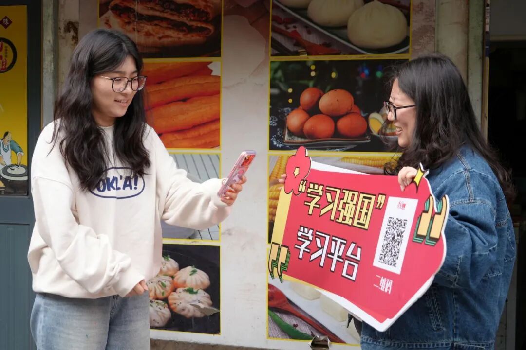 在“学习强国”学习平台导航站,工作人员耐心引导居民下载注册、参与挑战答题,现场气氛热烈。一位成功通关的青年党员赢得纪念品后兴奋地说:“今天边玩边学,感觉特别有收获。”