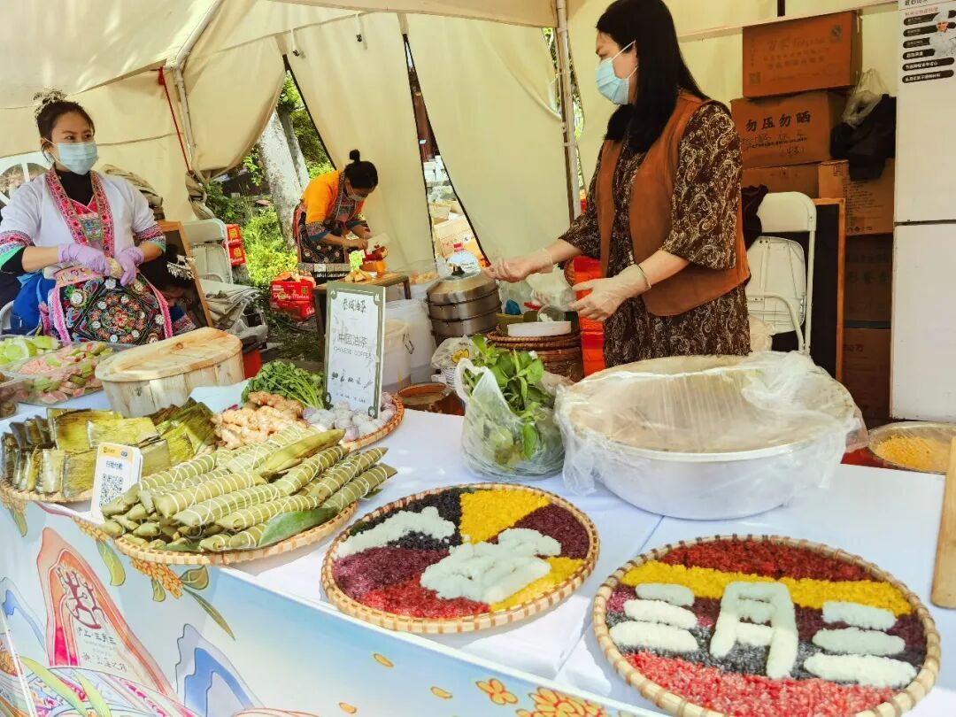 在富林台的非遗美食集市上,螺蛳粉特有的酸辣鲜香在空气中弥漫,蒸锅热气腾腾,食客们端着碗大快朵颐,赞叹声、欢笑声与锅铲碰撞声交织在一起,烟火气十足。一旁的非遗文创摊位上,色彩斑斓的绣球和壮锦吸引了不少游客驻足把玩、选购。上海市广西商会常务副会长廖理秀介绍,本届上海“广西三月三”文化旅游品牌活动中,上海市广西商会共组织了50余家会员单位参加,除了邀请广西本土的山歌队、舞狮队赶来助兴,还带来了“广西三大米粉”——老友粉、螺蛳粉、桂林米粉,以及地标鸡、玉林三黄鸡、果酱烧烤、酸嘢等特色美食。
