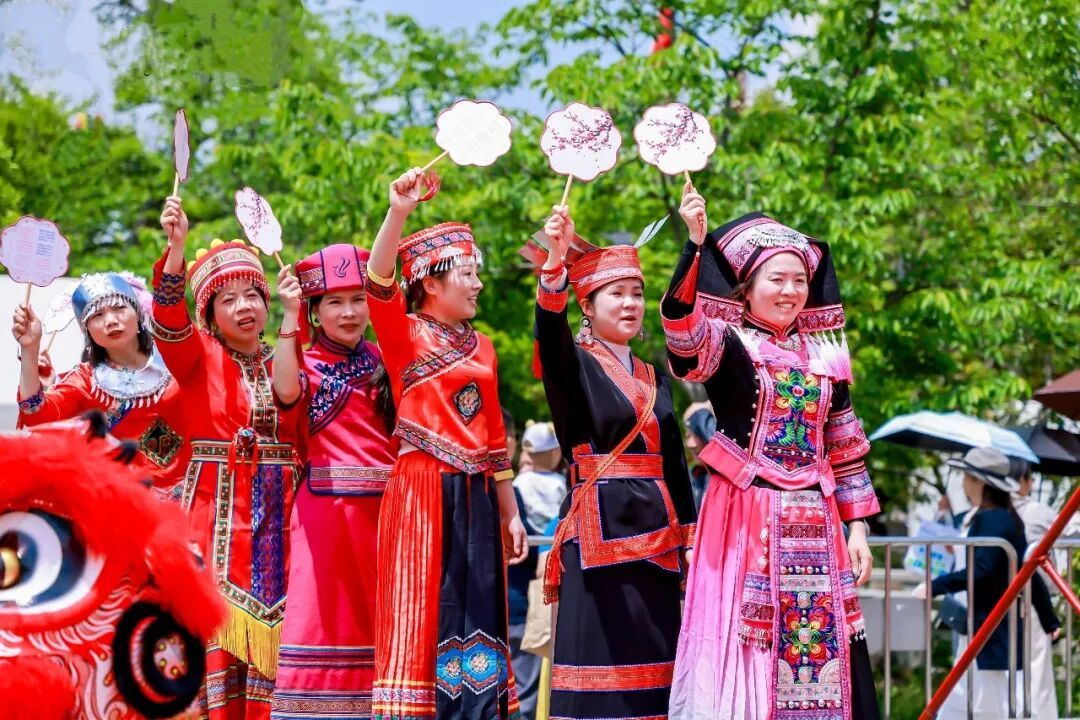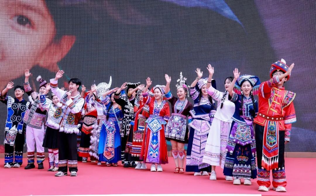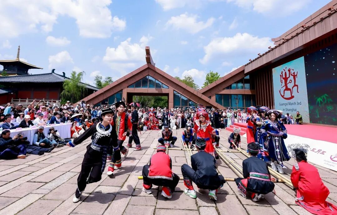 欢快的歌声还在耳边回荡,一群身着少数民族盛装的年轻人抬着竹竿小跑到了台前。随着清脆的敲击声响起,他们裙摆飞扬,银饰叮当,时而轻盈跃起,时而敏捷穿梭,脚步随竹竿开合变幻出各种花样。一曲舞罢,现场掌声如雷,市民纷纷上前围着他们合影。值得一提的是,表演竹竿舞的34名演员均为上海工程技术大学学生,其中大多数为广西籍,还有维吾尔族、傣族、蒙古族、哈尼族等少数民族的学生。