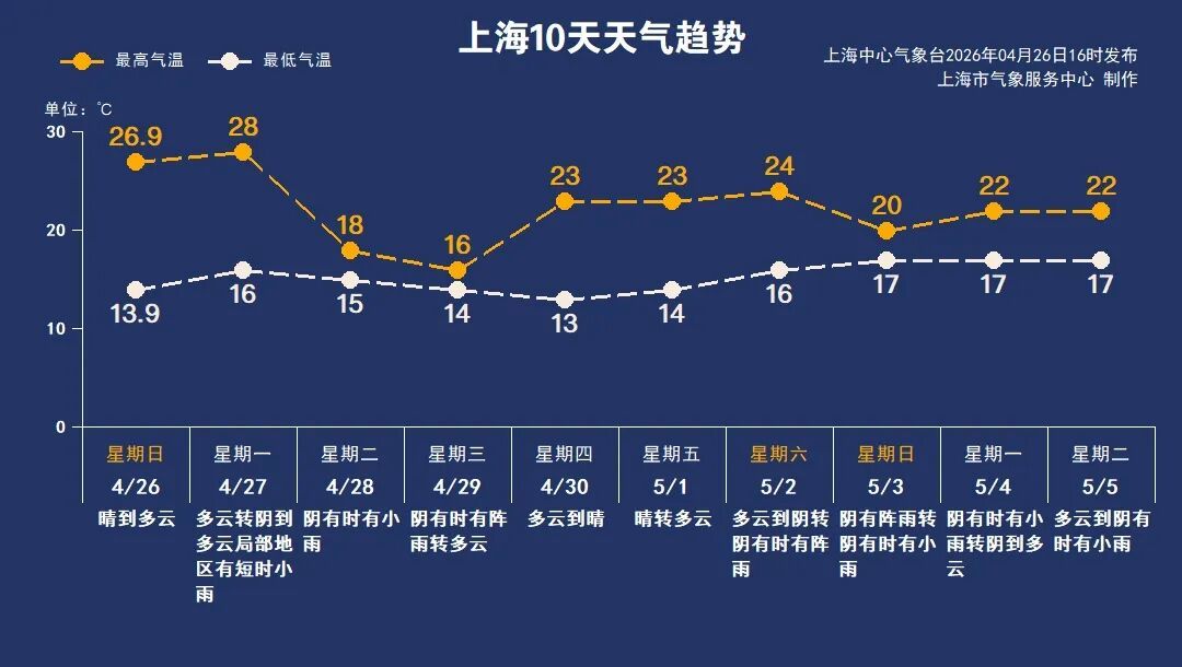 明天白天以多云为主,最低气温16℃,最高气温攀升至近期高点,可达28℃,昼夜温差大,早晚可以备件外套。偏南风3~4级,沿江沿海地区4~5级,相对湿度90%~55%,体感较适宜。需要注意的是,明天夜间云系增多,局部会出现短时小雨,夜间出行注意交通安全。