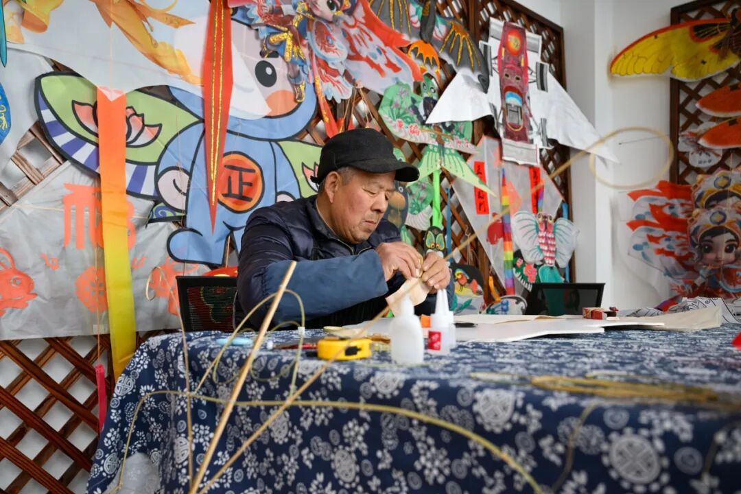 陈庆福儿时就跟着村上的手艺人学做风筝,还加入了徐行风筝队,于他而言,制作风筝就像吃饭一样简单。不用看图纸,只需一捆细绳就能扎出各式各样的风筝。