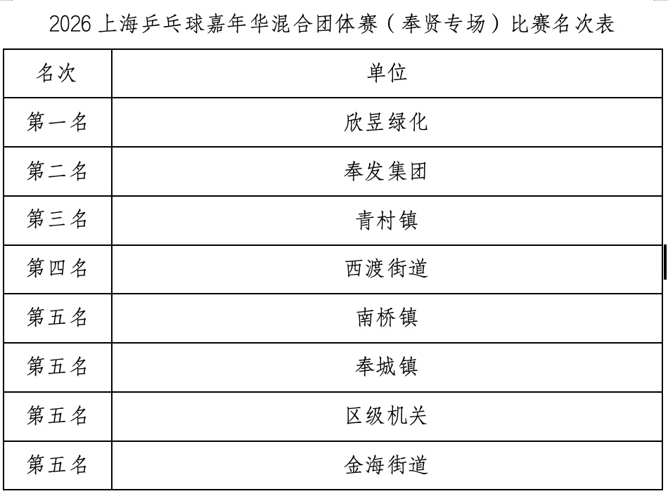 区级机关队、南桥镇队、奉城镇队、金海街道队凭借稳定发挥,并列获得本次赛事第五名,用实力展现了贤城乒乓的深厚底蕴与多元风采!