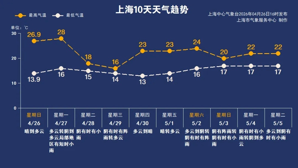 【最高可达28℃】白天以多云为主,最低气温16℃,最高气温攀升至近期高点,可达28℃,昼夜温差大,早晚可备件外套。相对湿度90%-55%,体感较适宜。需注意,夜间云系增多,局部会现短时小雨,夜间出行注意安全