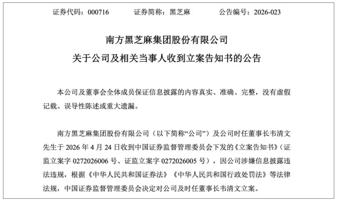 近日,南方黑芝麻集团股份有限公司发布公告称,因公司涉嫌信息披露违法违规,中国证监会决定对公司及公司时任董事长韦清文立案调查