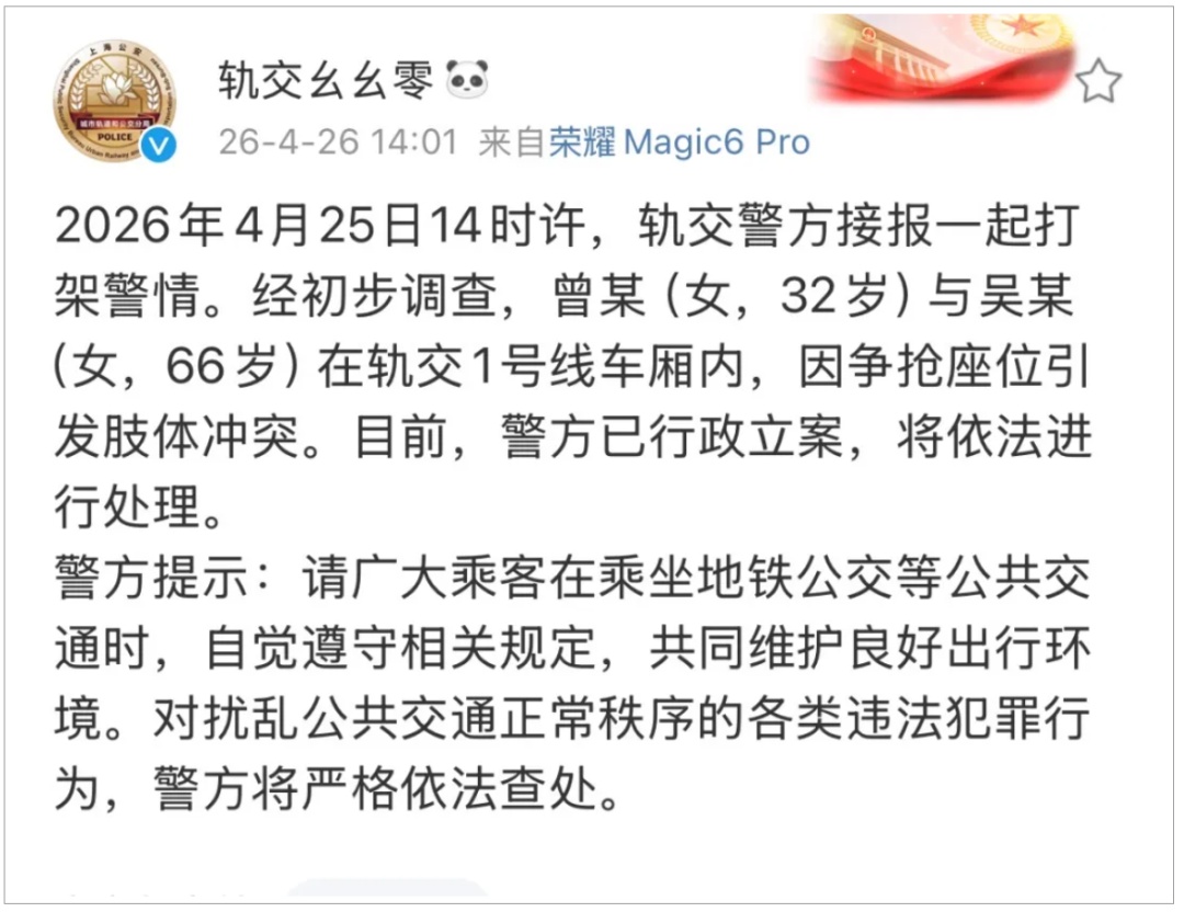 针对网传“女子在地铁与老人激烈扭打”一事,上海@轨交幺幺零 通报:2026年4月25日14时许,轨交警方接报一起打架警情。经初步调查,曾某(女,32岁)与吴某(女,66岁)在轨交1号线车厢内,因争抢座位引发肢体冲突。目前,警方已行政立案,将依法进行处理。