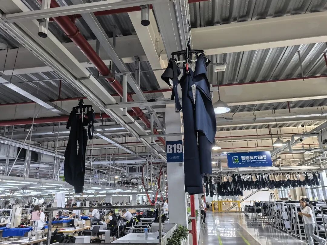 生产环节中,AGV物料配送车按系统指令自动将布料从智能分拣仓送至裁床,经电脑确认后裁床自动裁剪,所有裁片通过吊轨精准送达对应缝制工位。成衣缝制完成后进入智能化仓储分拣系统,系统自动匹配上衣与裤子并将整套服装送至打包口,彻底改变以往依赖大量工人在仓库四处分拣的模式。