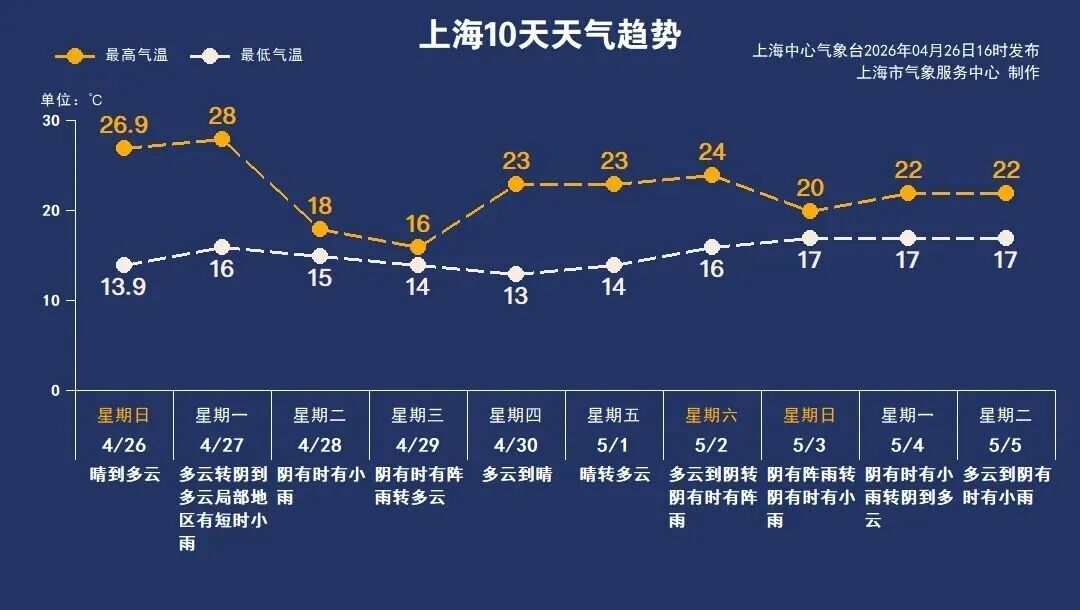 保持赤诚与热爱,步履不停,遇见更好的自己。 今日天气 气温攀升,最高可达28℃ 昼夜温差大,备件外套 体感较适宜 夜间局部会出现短时小雨 今天白天以多云为主, 最低气温16℃, 最高气温攀升至近期高点, 可达28℃,昼夜温差大, 早晚可以备件外套。 偏南风3~4级, 沿江沿海地区4~5级, 相对湿度90%~55%, 体感较适宜。 需要注意的是, 今天夜间云系增多, 局部会出现短时小雨, 夜间出行注意交通安全。 天气趋势 受短波槽影响,本周二至周三有一次明显的降雨大风过程,最高气温也会回落至16~18℃,体感如同换季,请大家及时增添衣物,备好雨具。周四至周五有短暂的晴好天气,气温回升,周六起阴雨再次上线。春季晴雨转换快,请大家关注最新天气预报信息。