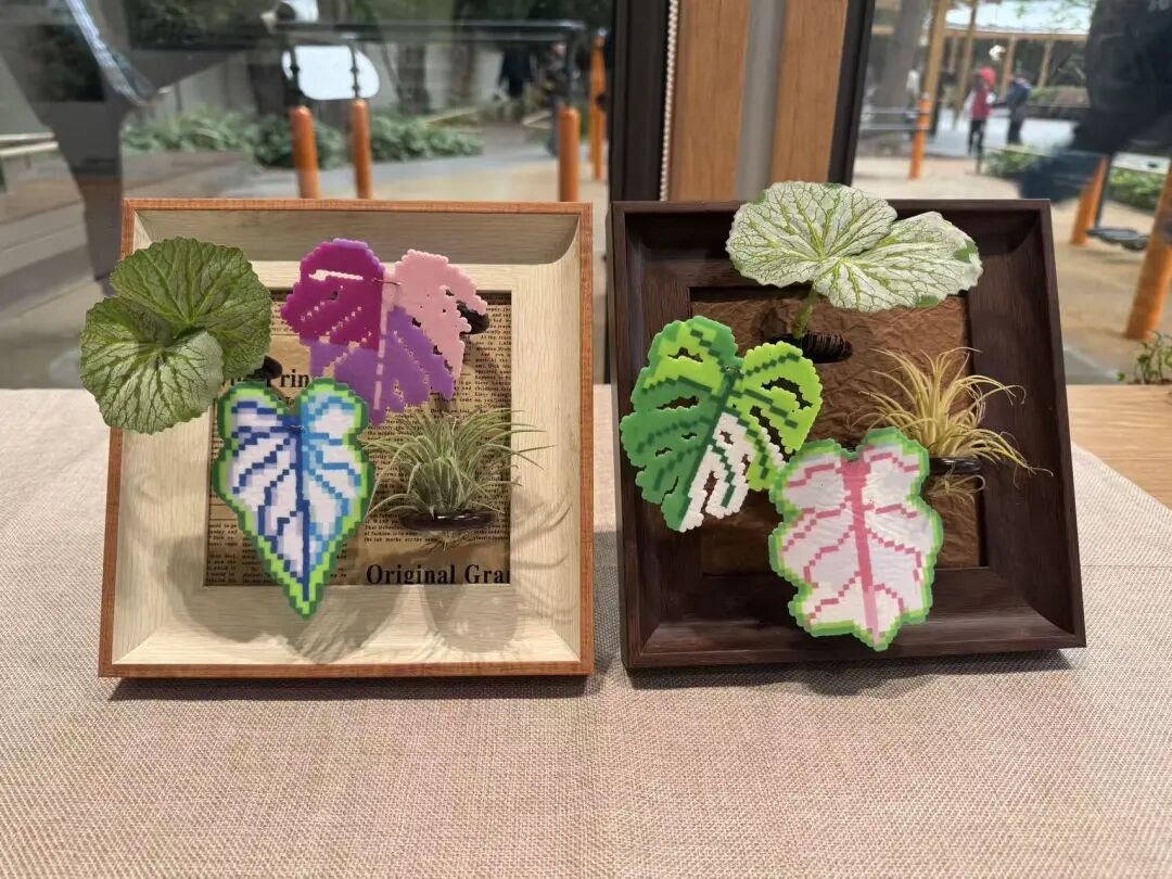 活动现场,参与者每人领取一份叶片拼豆材料包。在指导老师的带领下,大家用彩色拼豆模拟叶片形态,再组合成自然风格的相框摆件。拼豆作品虽小,但每一片“叶子”都需要耐心排列,色彩搭配也各有巧思。有人拼出热带叶片轮廓,有人尝试复刻春天常见植物的叶形。不到一小时,风格各异的拼豆相框陆续完成。