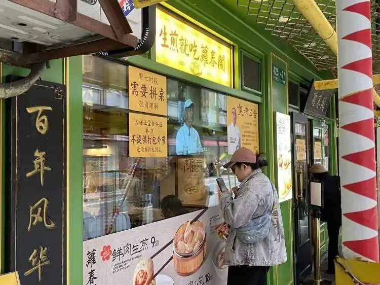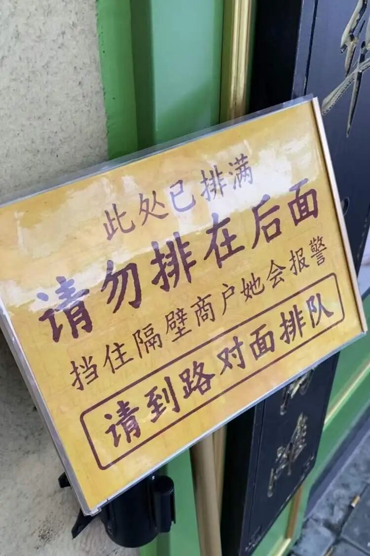 近日,有市民发现,上海老牌生煎店“复牌”后,门外出现了许多黄底黑字的告示牌,其中一个牌子颇为引人注意,上面写着:“请勿排在后面,挡住隔壁商户她会报警,请到马路对面排队。”