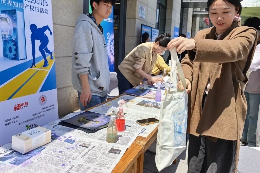 手工台前,挑选喜欢的法治与知识产权图案,拿起喷漆轻轻一喷,专属的法治帆布包很快就完成了,把“保护知识产权”的理念亲手印在包包上,好玩又有意义。