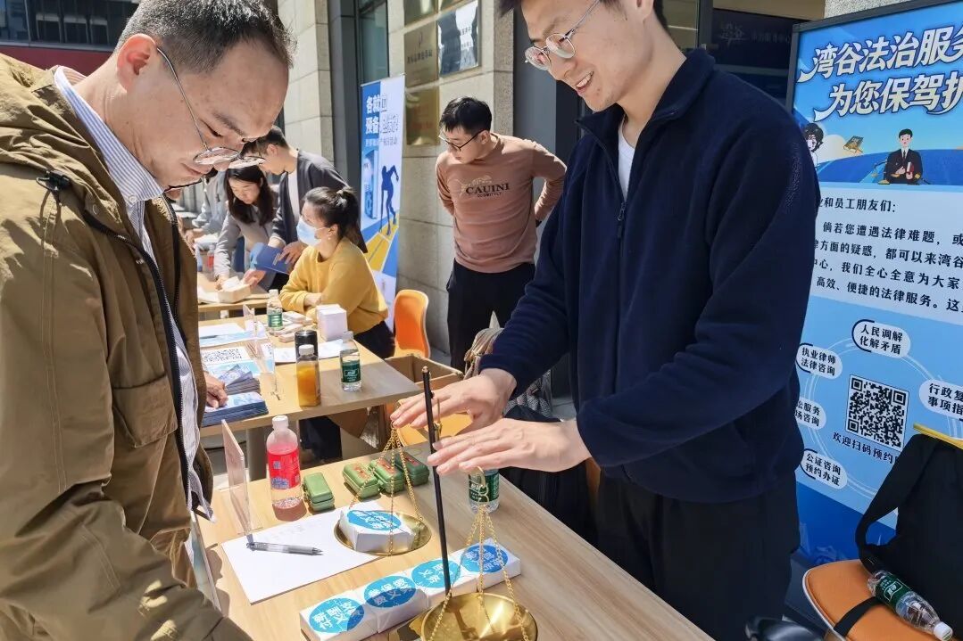 中午时分,湾谷科技园湾谷法治服务中心门口举办的游园活动立即吸引了午休的白领们。大家被“法治天平”小游戏吸引,通过将砝码一一配对,听法官详解“权利”与“义务”,在平衡与选择中理解法律内涵。有的参与者们在“法治圈圈乐”游戏前排起了队,大家瞄准、出手、套中,成功者可继续参与知识产权小问答。检察官在一旁耐心讲解,大家在轻松玩乐中把知产知识记牢。