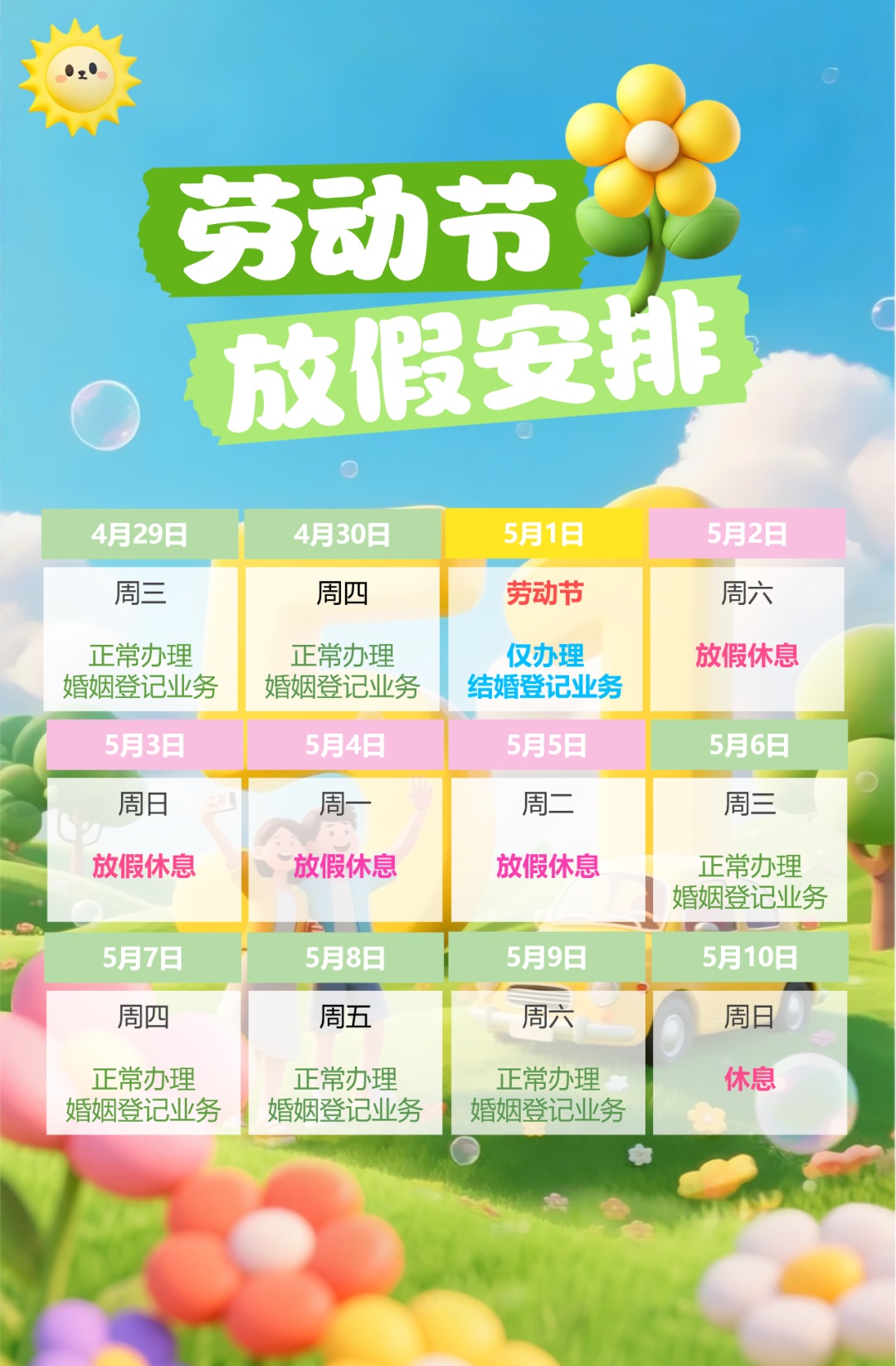 根据《国务院办公厅关于2026年部分节假日安排的通知》和上海市民政局相关通知精神,宝山区婚姻登记管理所2026年劳动节期间放假安排如下: