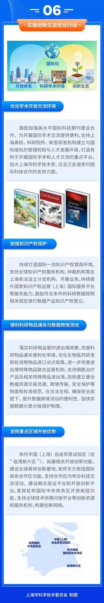 答:优化创新生态是一项系统性工程,我市将围绕如何提高各类主体在沪开展创新合作的便利度、满意度和获得感,持续优化政策举措,打造“组合拳”,回应“关切点”,将上海真正打造成为全球创新创业者心目中的“首选之地”。比如,打造更加便利、更加丰富、更高质量的国际学术交流渠道和平台,进一步体系化加强知识产权保护。在科研物品通关便利化方面,鼓励企业开展“经认证的经营者”(AEO)培育认证,支持细胞治疗产品及相关特殊物品进出境。在发挥重点区域开放优势方面,发挥东方枢纽国际商务合作区功能,支持在合作区合作举办专业学术会议等科技交流活动,合作建设概念验证平台和开放创新平台。