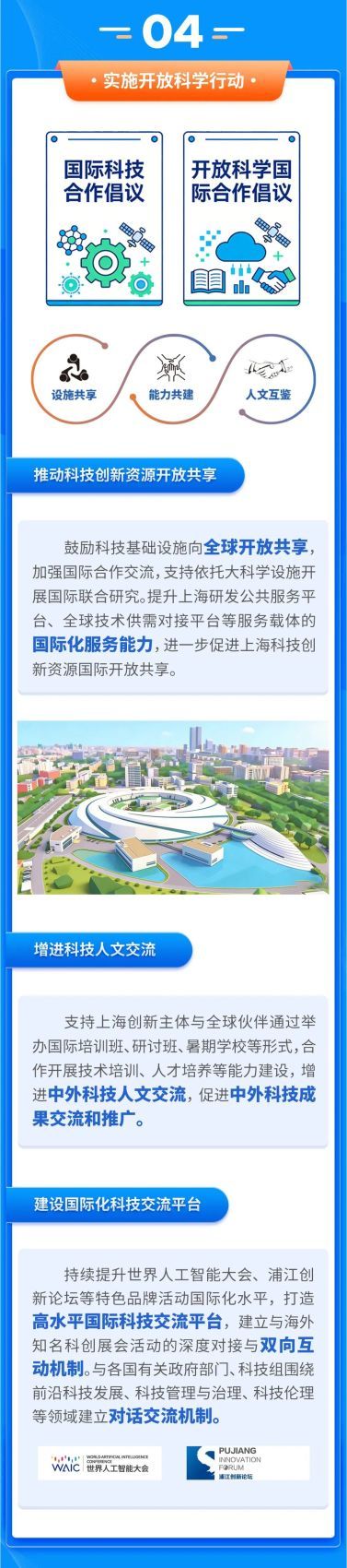 答:《伙伴计划》拟从下列方面推动科技创新开放合作。一是引育发展国际科技组织,为提升上海在全球科技治理中的参与度,加快在优势领域培育发起一批国际科技组织,吸引有影响力的国际科技组织来沪发展。通过积极、有效做好服务保障,推动各类型国际科技组织在沪广泛开展国际交流,推动我市各类创新主体与国际科技组织的合作。二是加强创新资源共享,加强资源共享、充分利用上海在大科学装置上的“硬”优势,围绕装置的建设、运行等各阶段,依托装置开展国际科技合作,进一步增强共享的实效与长效。如以光子大科学装置群为重点,通过与国外同类大科学装置的合作交流,促进在物质科学、生命科学等领域的合作研究以及科研数据等资源开放共享,吸引全球科学家来沪开展高水平联合研究,提升上海在全球科技创新版图中的地位与影响力。三是推动科技人文交流,促进创新互鉴,打造品牌化、国际化的高水平国际科技交流平台与机制性对话交流活动。充分利用上海在科技人文交流上的“软”实力,通过培训班、研讨会等形式,开展合作交流,共同促进科研能力提升;充分利用上海作为国际化交流窗口的优势,持续提升世界人工智能大会、浦江创新论坛等平台的国际影响力。