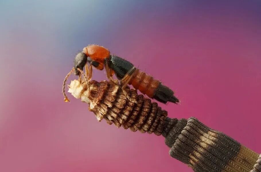 隐翅虫俗称“影子虫”“青腰虫”,体型细长,约5-10毫米,红黑相间,翅膀平时折叠隐藏在前翅下方,看似无害,实则暗藏强酸性毒液(pH值1-2),仅毒隐翅虫亚科的20多种对人有威胁,我国常见的有两三种。每年6-9月是其活动高峰期,夜间会循着灯光飞舞,常飞入室内或停留在人体皮肤上。
