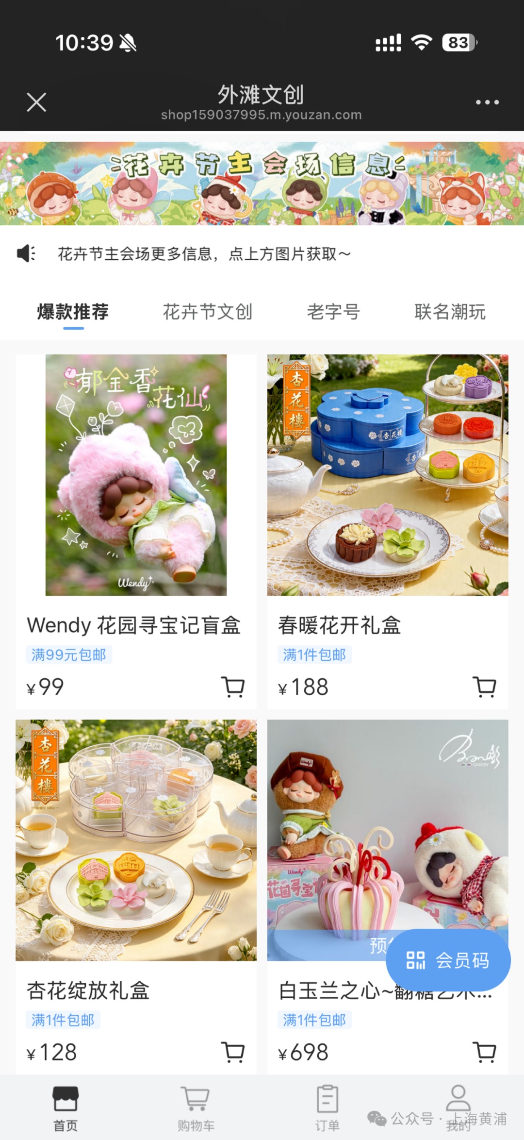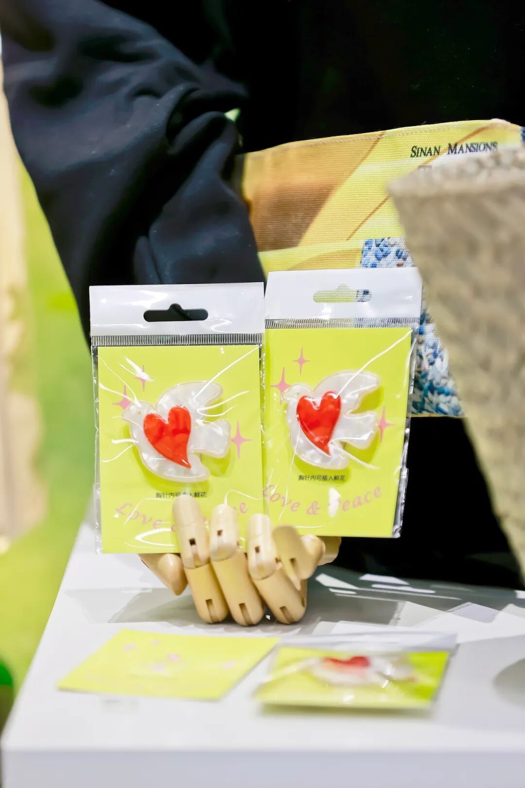 王女士孩子手里的Wendy宝宝盲盒,是黄浦文创的销量冠军,一共有6款常规款加1款隐藏款,每一款都与花卉相关;而她提到的9块9花束,是门口云花花摊的主打产品,亲民的价格让爷叔阿姨、年轻人都爱不释手。除此之外,恒源祥马年定制丝巾,思南公馆专属的可插小花胸针,更是成为现场的“爆款”,每一件产品都藏着春日的心意。