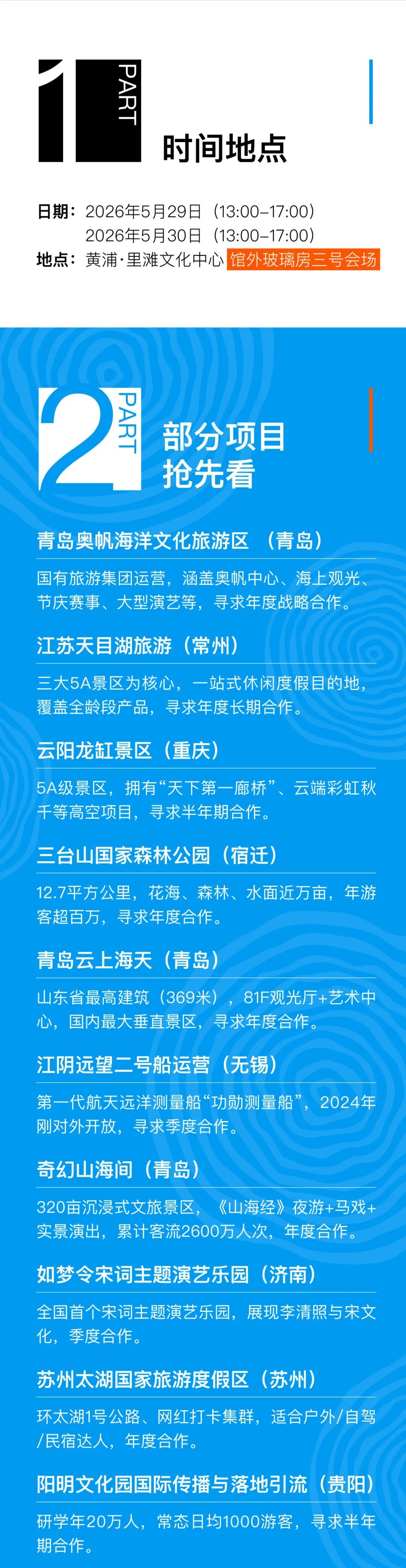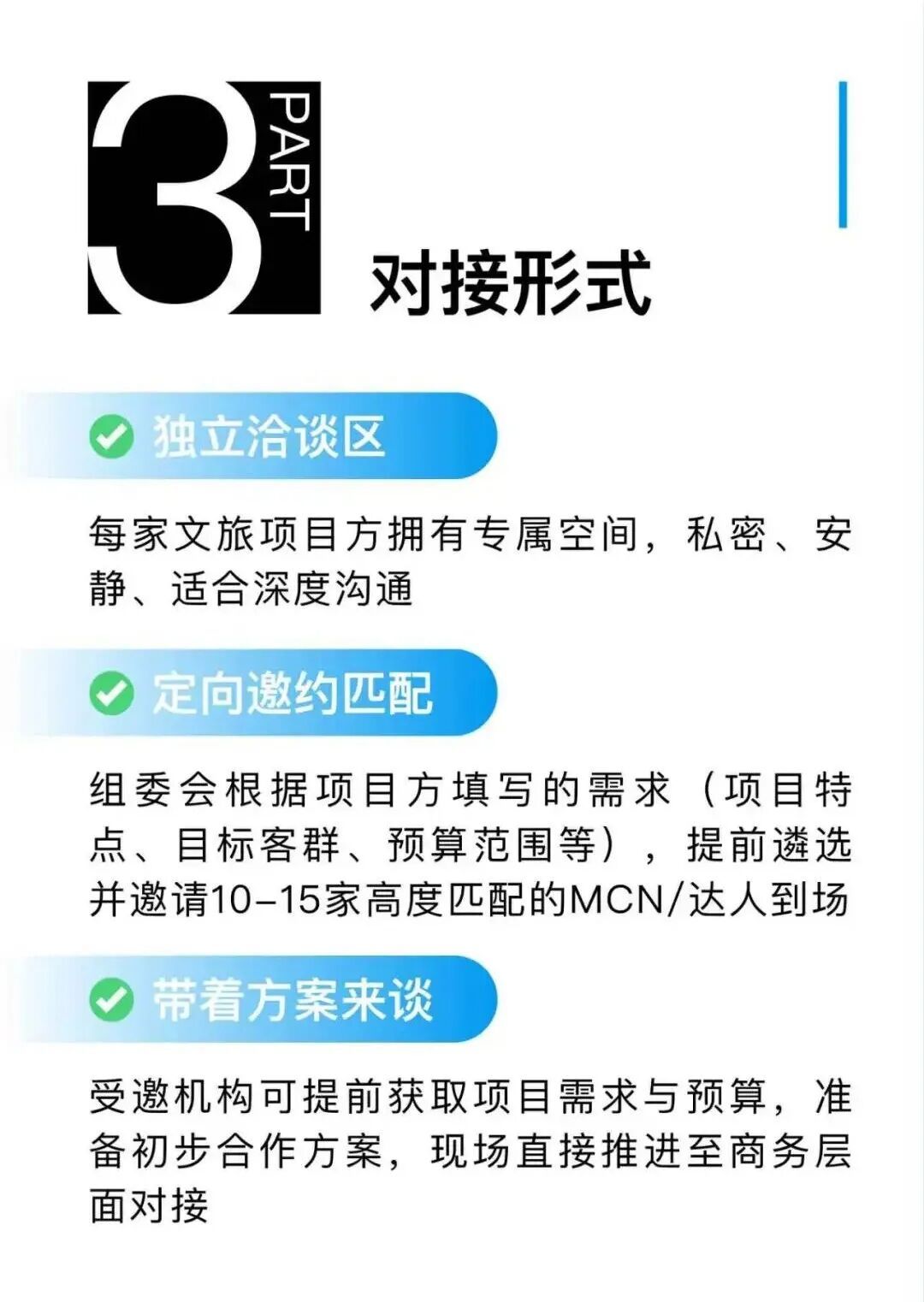 目前已邀请到“青岛奥帆海洋文化旅游区 ”“苏州太湖国家旅游度假区 ”“如梦令宋词主题演艺乐园 ”等30余个来自山东、江苏、重庆、贵州、四川、湖北等省市的文旅项目,营销预算从数十万至百万不等,总预算规模超千万。