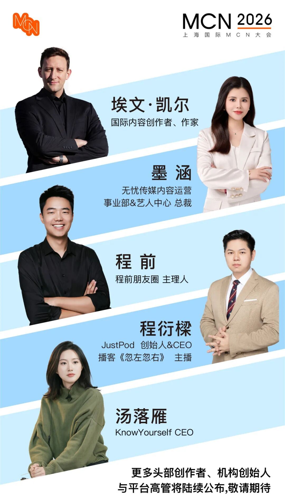 圆桌讨论将以“优质内容驱动下的增长创新与商业新范式”为议题,汇聚国内最具代表性的内容创作与 MCN 领军力量。头部MCN内容操盘手、商业洞察 IP 创始人、播客生态引领者、心理内容先锋等行业大咖同台对话,以内容为根基、以创新为动力、以商业为目标,探讨AIGC 赋能、内容创作升级、商业变现创新、多元业态拓展等行业前沿议题。
