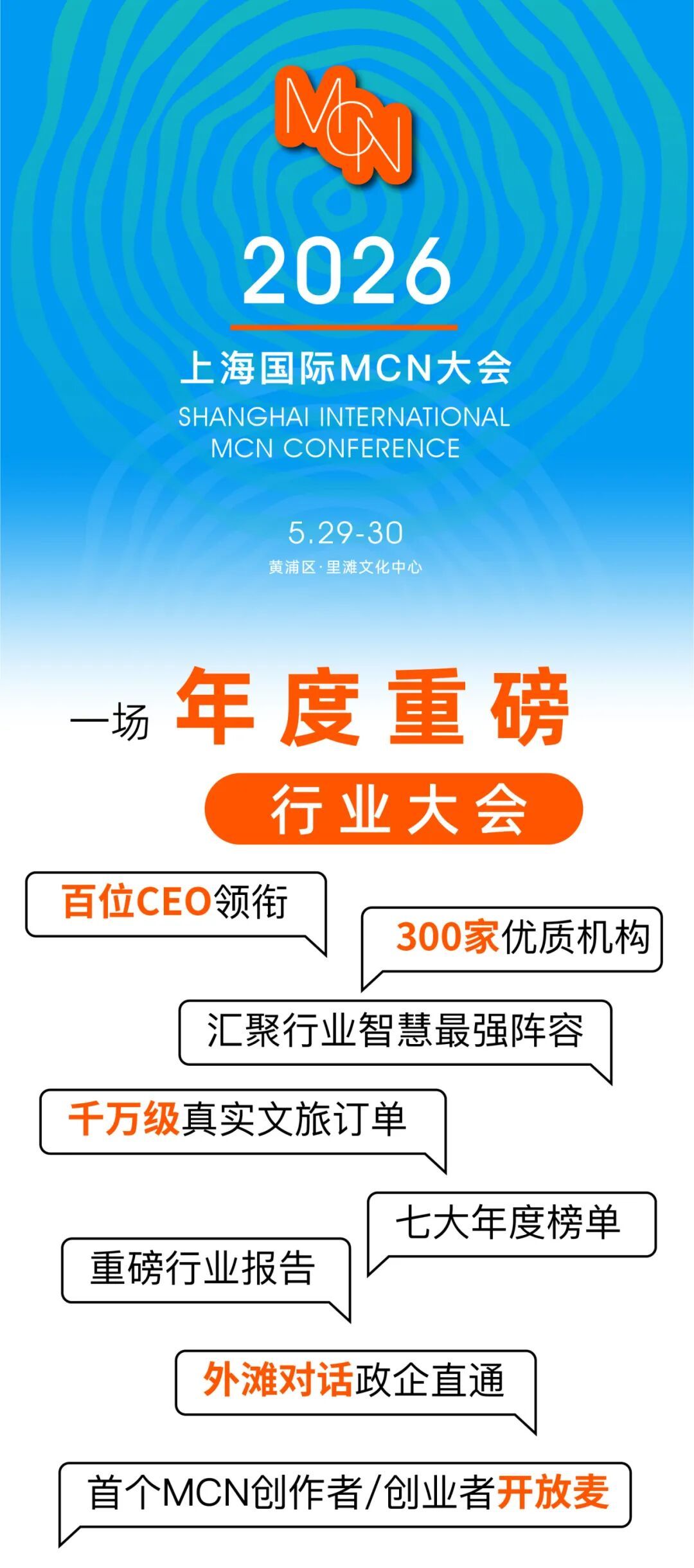 在此背景下,由上海市国际贸易促进委员会主办,全国唯一由宣传、网信、商务、文旅四大部门共同指导,以“内容无界·价值可见”为主题的2026上海国际MCN大会,将于5月29日至30日在上海黄浦区·里滩文化中心举行。