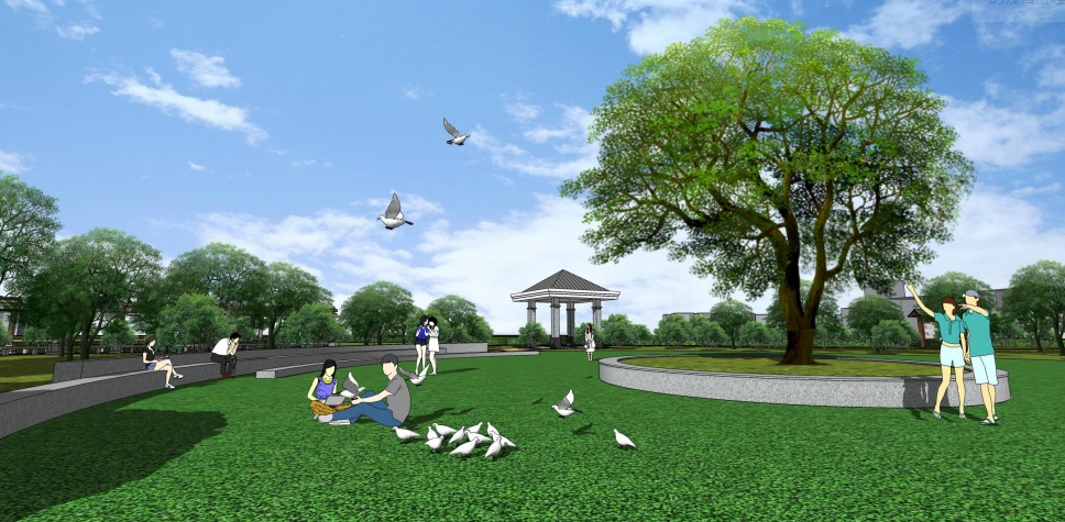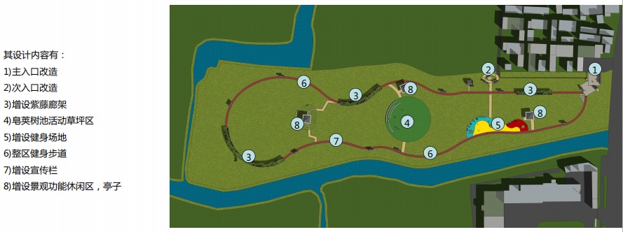在绿化配置方面,为营造园内春花秋色、四季分明的绿化景观,植物种类以本土树种为主,在原有香樟林的基础上,增设桂花林,并在健身步道周边种植紫藤,植物空间以开敞和半开敞空间为主。