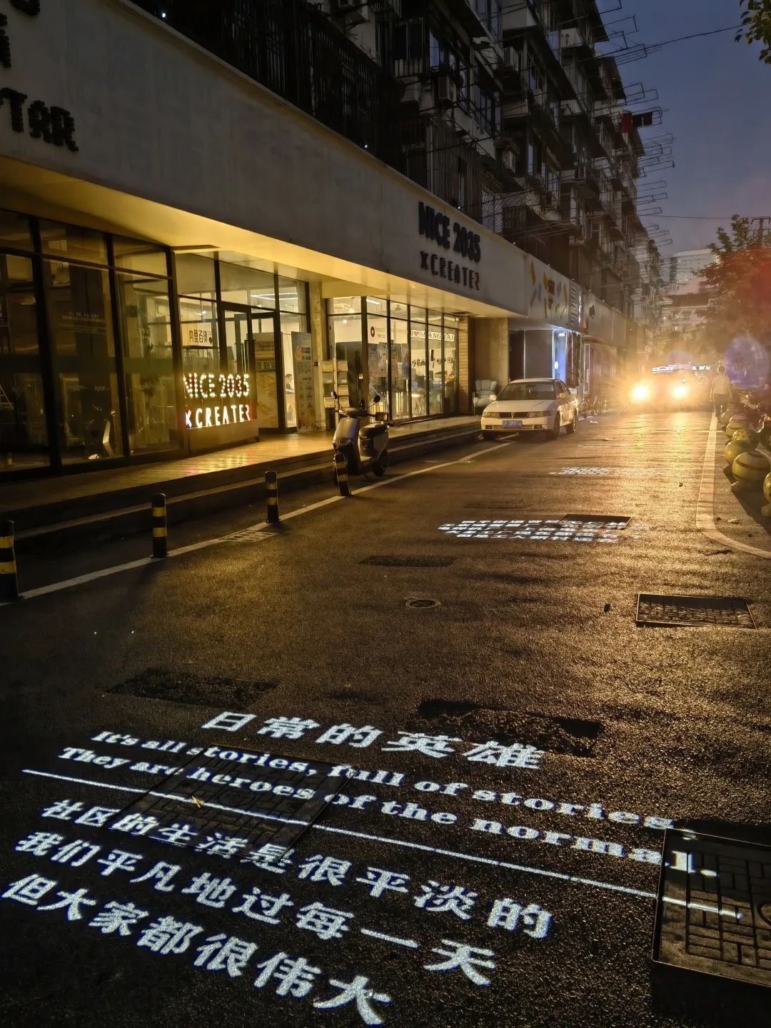 四平路1028弄的“诗歌单行道”,把居民生活在四平的记忆记录下来,投映在弄堂的地面上,唤起街坊邻里的共同记忆。夜幕降临时,每一个路过的居民都会放慢脚步,回味社区生活的点点滴滴。