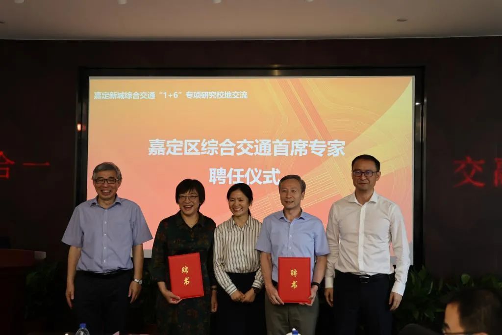 随后,嘉定区交通委党组书记、主任陆凤为交通运输工程学院博士生导师吴兵,铁道与城市轨道交通研究院院长、国家磁浮交通工程技术研究中心主任、博士生导师陈小鸿颁发“嘉定区综合交通首席专家”聘书。