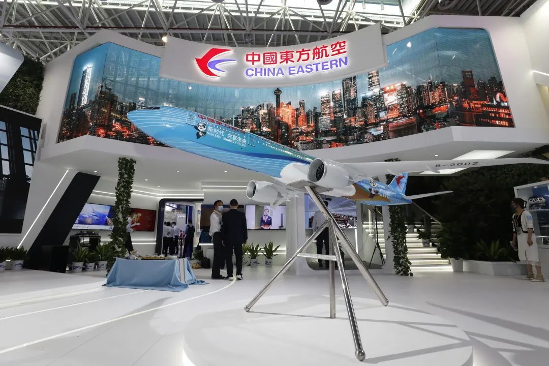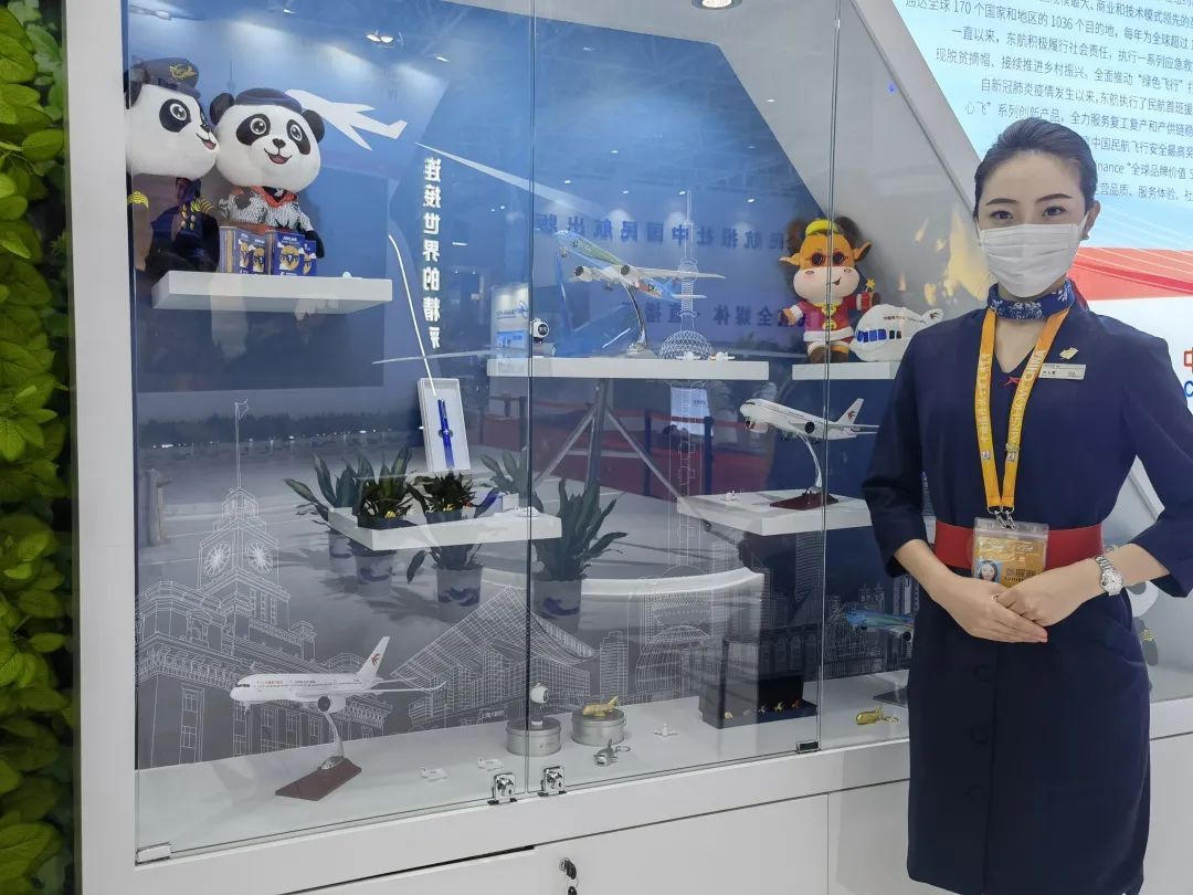 本届航展,东航展位设置于航空航天馆内,在150余平米的展位上,东航以白色为主基调,以总高度6米的双层结构进行搭建,借助展板和电子显示屏,将展台自然分割成企业形象宣传区、科技展示区、绿色概念区等特色展示区域。东航B777“进博号”彩绘机机模居中摆放,将创新、协调、绿色、开放、共享的新发展理念融入展位布局,以此欢迎远道而来的每一位观众。在二层展台曲面LED屏上,中国东方航空logo置于醒目位置,东航品牌宣传片、环保宣传片在展区内循环滚动播放,以“声光电”等多种形式为旅客带来环绕式、沉浸式观展体验。
