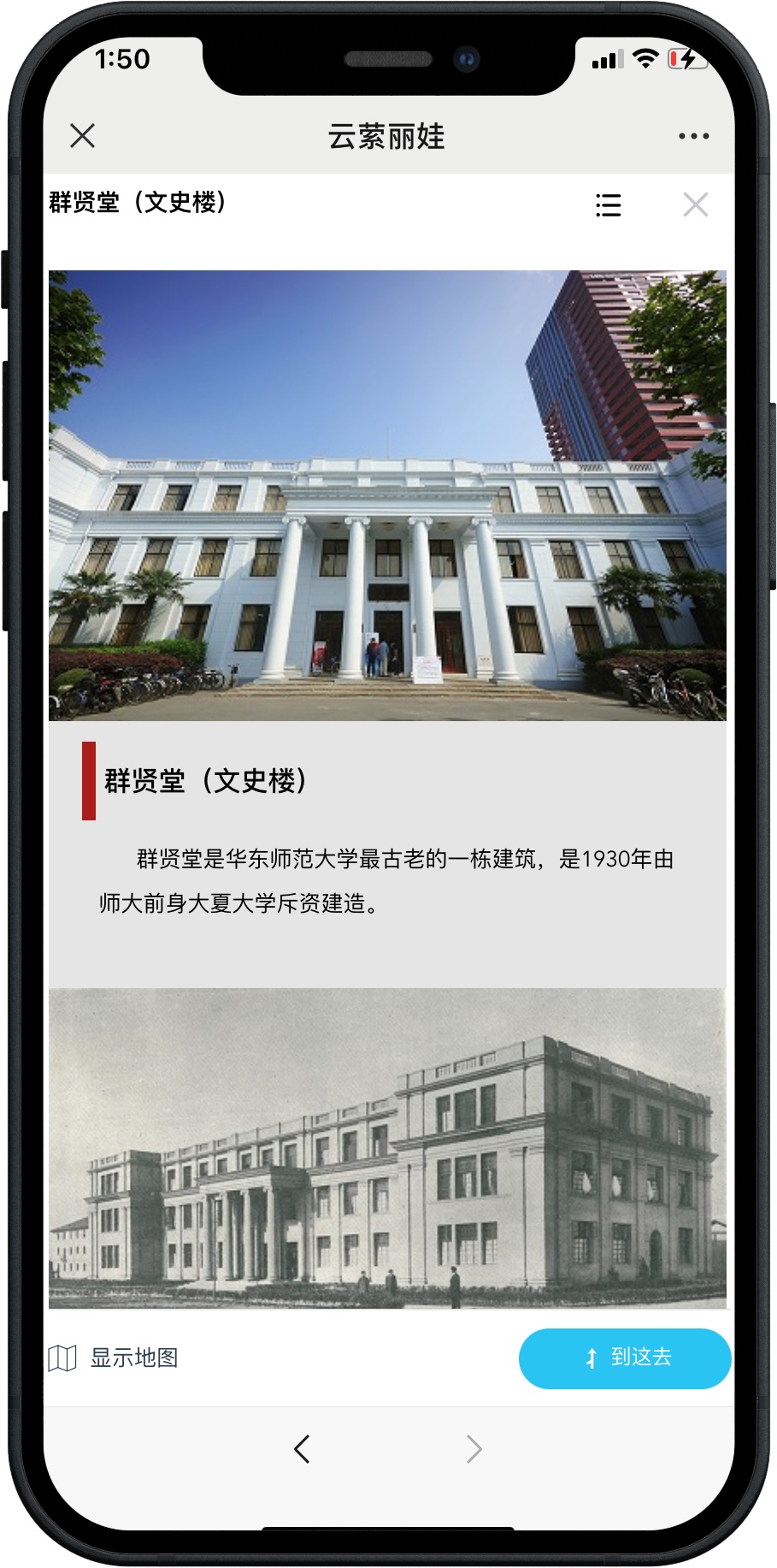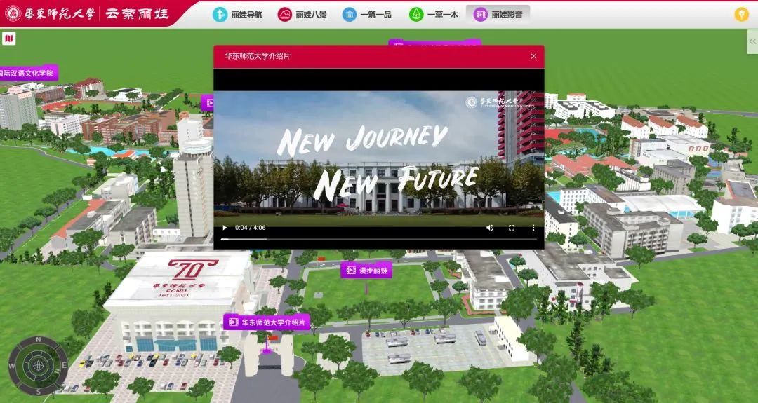“云萦丽娃”集成“丽娃导航”、“丽娃八景”、“一筑一品”、“一草一木”、“丽娃影音”五大版块,用数字化手段传承华东师大的历史文化精神。