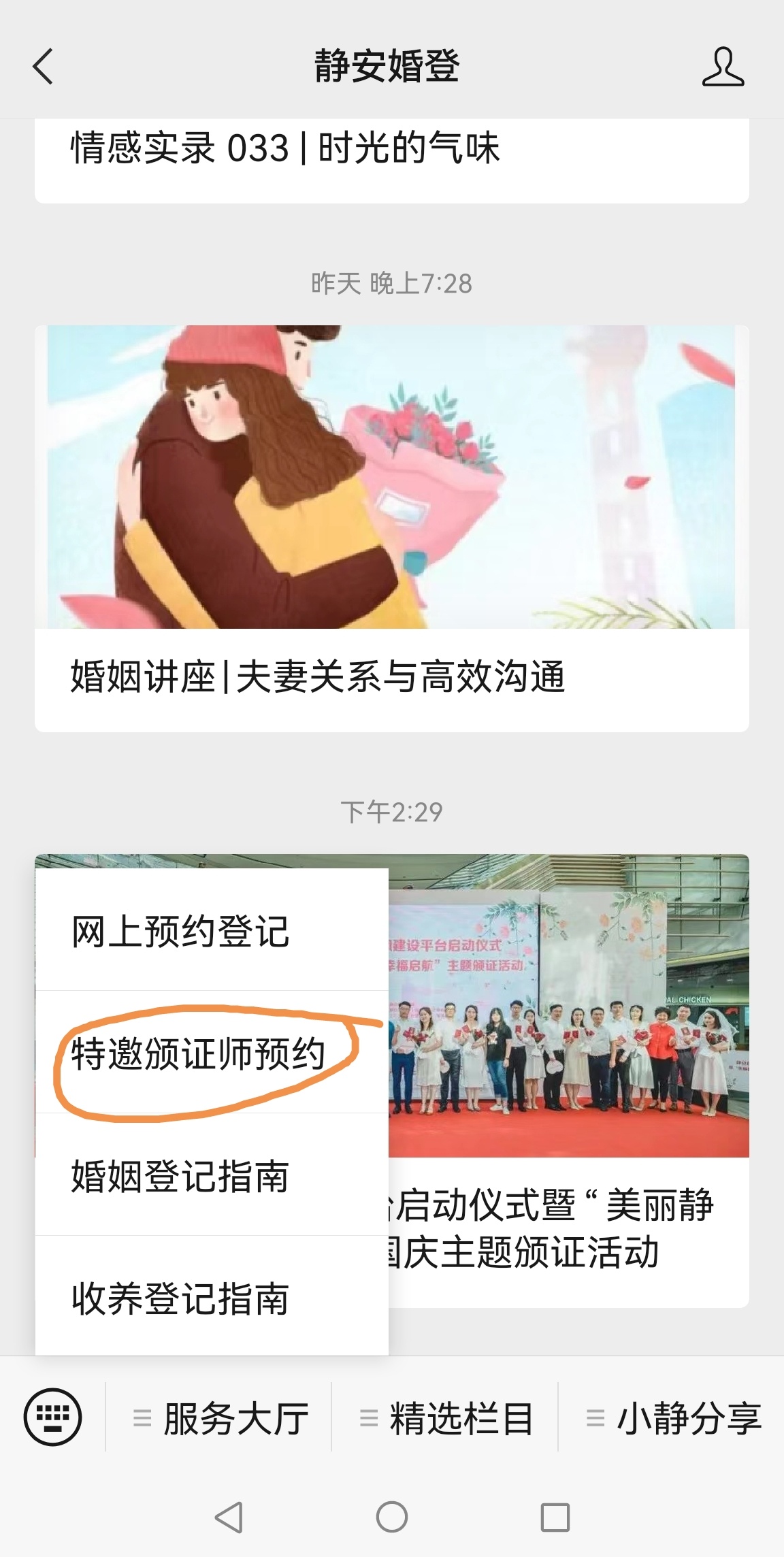 进入“静安婚登”微信公众号,在服务大厅一栏选择“特邀颁证师预约”,新人们就可以提前自主选择自己中意的颁证师……记者看到,通过全新上线的家风建设平台的特邀颁证师线上预约板块,在静安登记的新人们可以从由优秀企业家、专家学者、三八红旗手、先进家庭等社会贤达组成的特邀颁证师库和主题颁证活动中自主选择,成为好家风好家训的传承者,文明、向上婚俗新风的践行者。