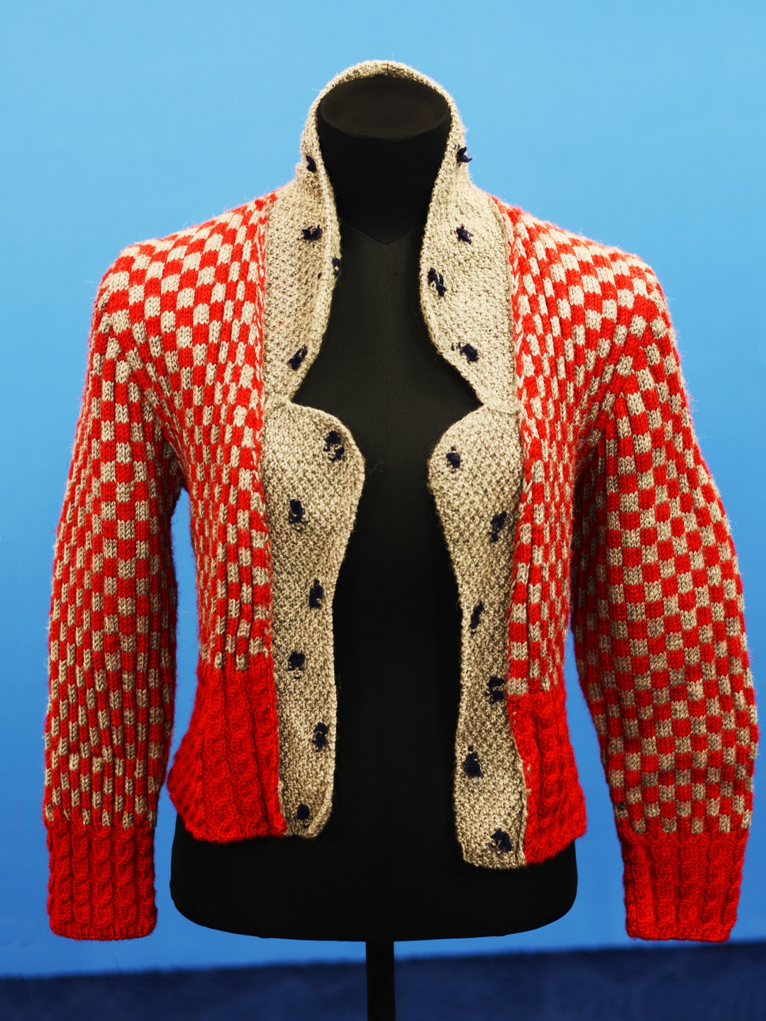 右图为复刻的冯秋萍编结作品《时式反领新装》,鲜明地凸显出海派绒线编结中西合璧的特色。