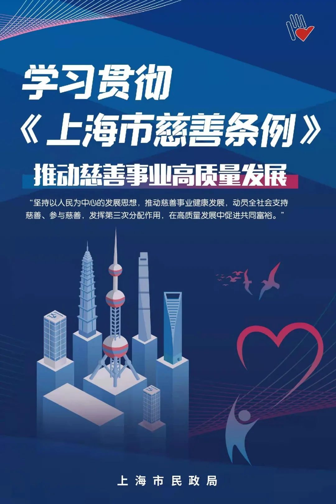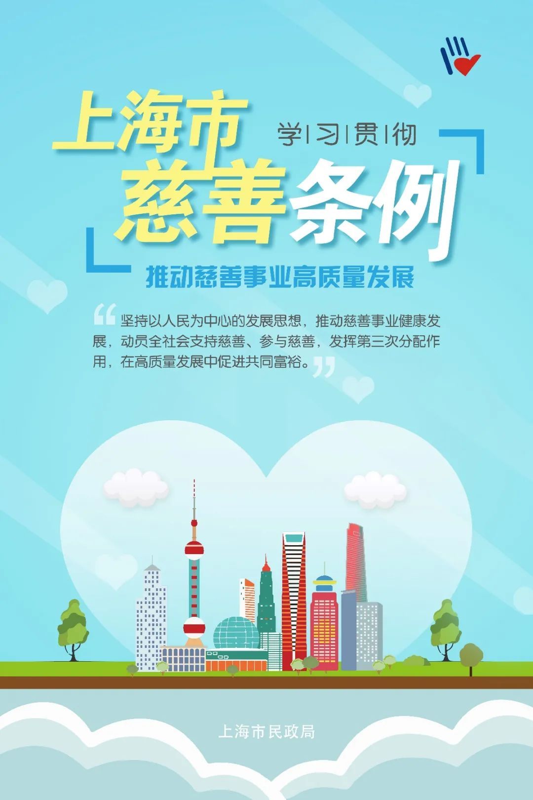 《上海市慈善条例》明确,市民政部门主管本市慈善工作。市民政局将联合相关单位,将各项措施落到实处,进一步推动和促进本市慈善事业高质量发展,充分发挥慈善事业作为第三次分配在调节收入、实现共同富裕上不可或缺的作用。
