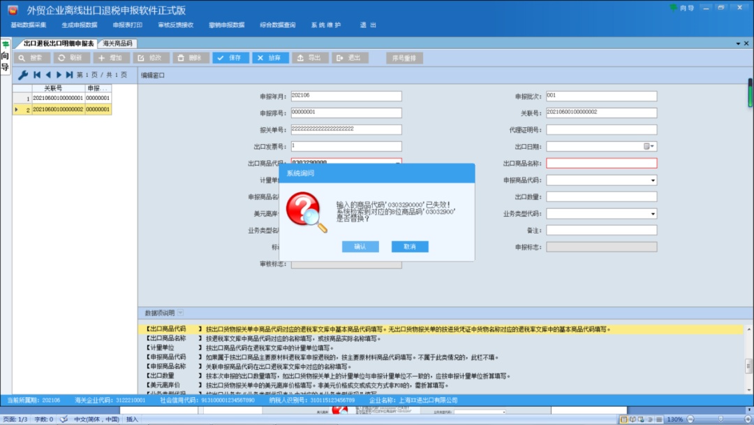 (一)商品代码已失效。该种情形系统会提示“输入的商品代码已失效!系统检测到对应的8位商品码,是否替换?”