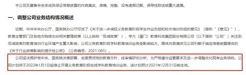 11月15日,主打一对一教学的学大教育发布公告,为严格遵守监管要求及进一步调整优化现有业务结构,公司计划将于2022年1月1日起停止开展义务教育阶段在线学科教育培训业务,该计划预计2021年12月31日前生效。