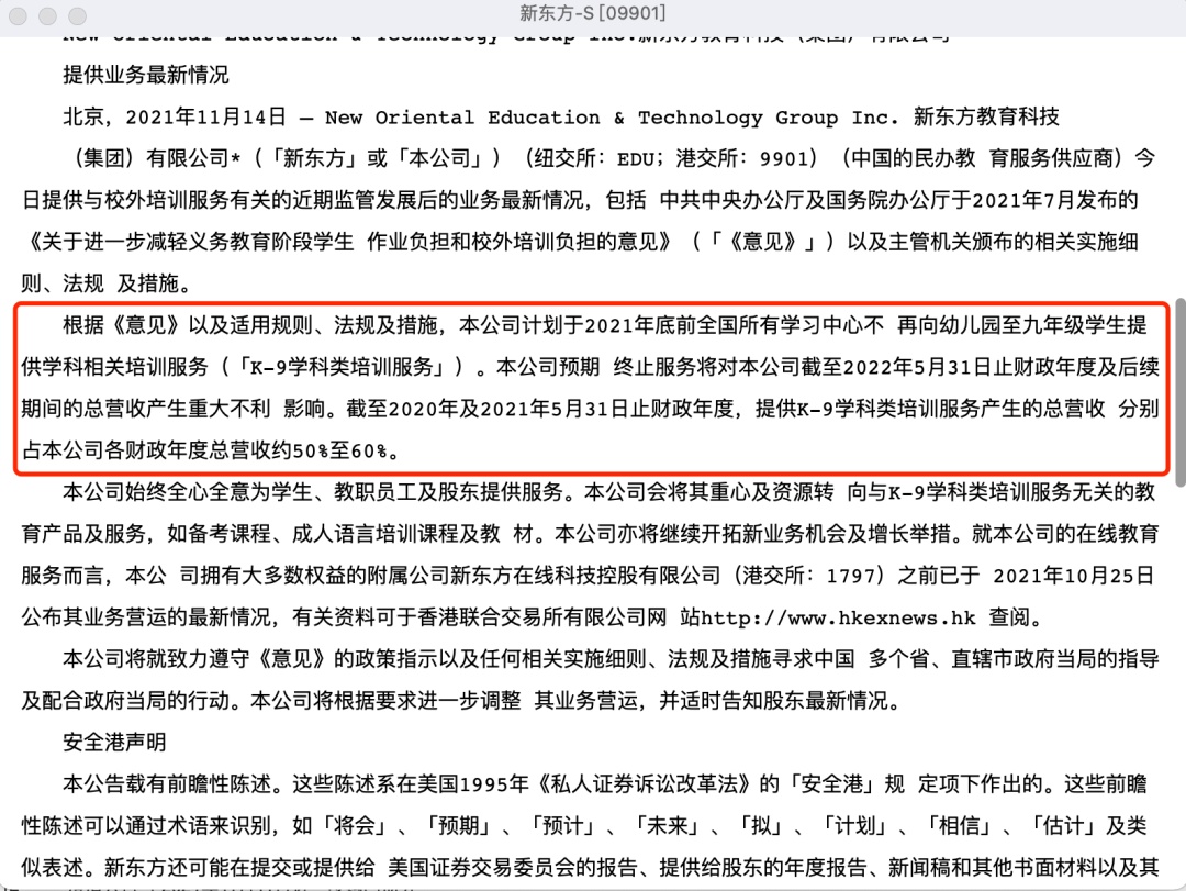 11月15日上午,新东方-S在港交所公告,计划于2021年底前,全国所有学习中心不再向幼儿园至九年级学生提供学科相关培训服务(K-9学科类培训服务)。