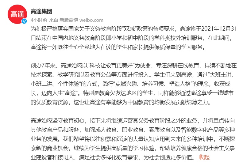 11月15日,K12在线教育巨头高途在其官方微博发布公告称,为积极严格落实国家关于义务教育阶段“双减”政策的各项要求,高途将于2021年12月31日结束在中国内地义务教育阶段即小学和初中阶段的学科类校外培训服务。在此期间,高途将一如既往全心全意地为在读的学生和家长提供保质保量的学习服务。