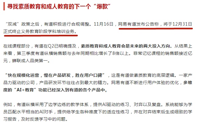 11月16日,网易有道发布公告称将于12月31日停止针对中国内地义务教育阶段学科类校外培训业务。