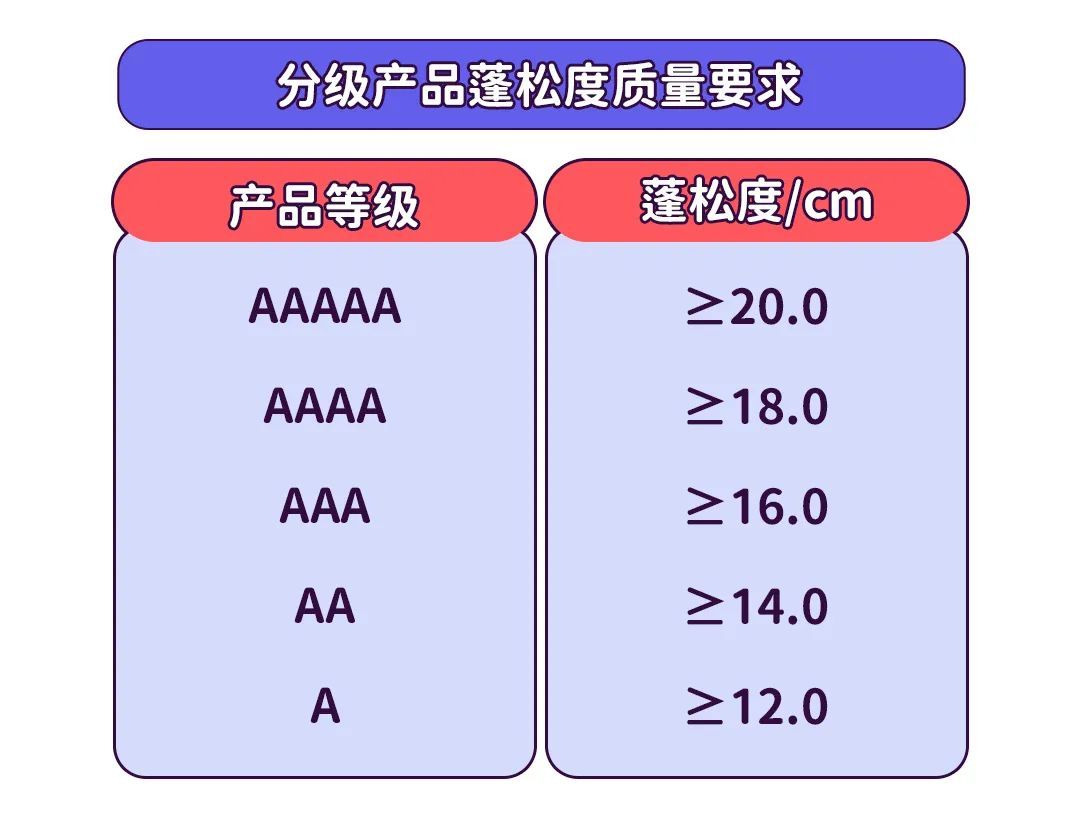 团体标准TB/T CFDIA 001-2016《羽绒分级标准》在羽绒及制品符合国家或行业现行标准的基础上,对羽绒蓬松度提出更高要求,产品等级越高表示羽绒的蓬松度越好,保暖性也随之越高。