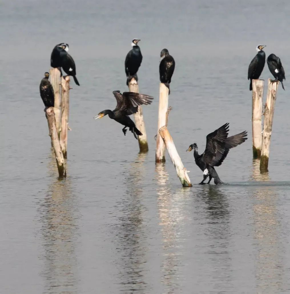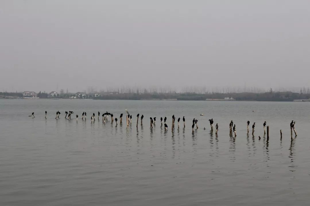 徐忠告诉记者,原本这些迁徙途中的鸬鹚来明珠湖“暂住”,每天早出晚归觅食,没有人知道它们每年抵达和离开的确切时间。后来,景区专门为这些“远客”添置了好几片集中的栖木桩,果然吸引了鸬鹚落脚,也为观鸟爱好者提供了一个绝佳的观测视角。