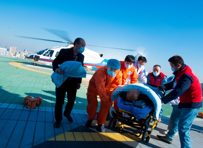 12月2日下午14点02分,瑞金医院门诊24楼的停机坪上,东一飞的救助直升机稳稳着陆,包括神经外科、神经内科、麻醉科、重症医学科等在内的6位医护早已待命就位。