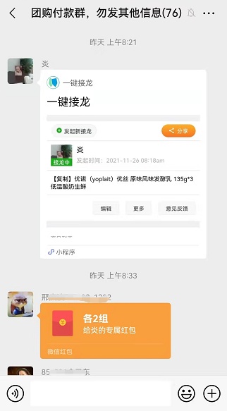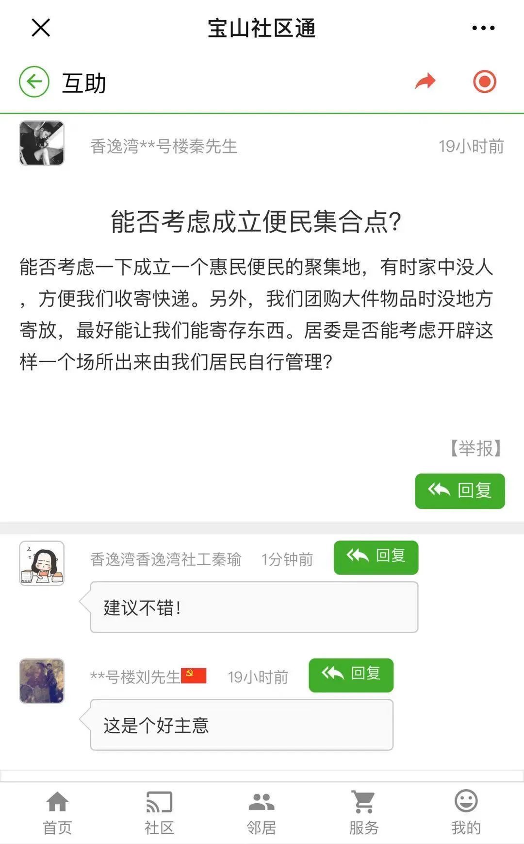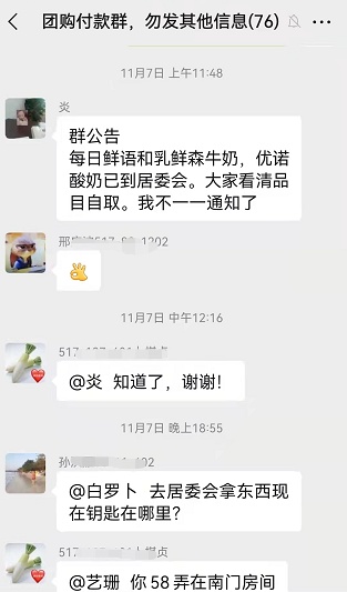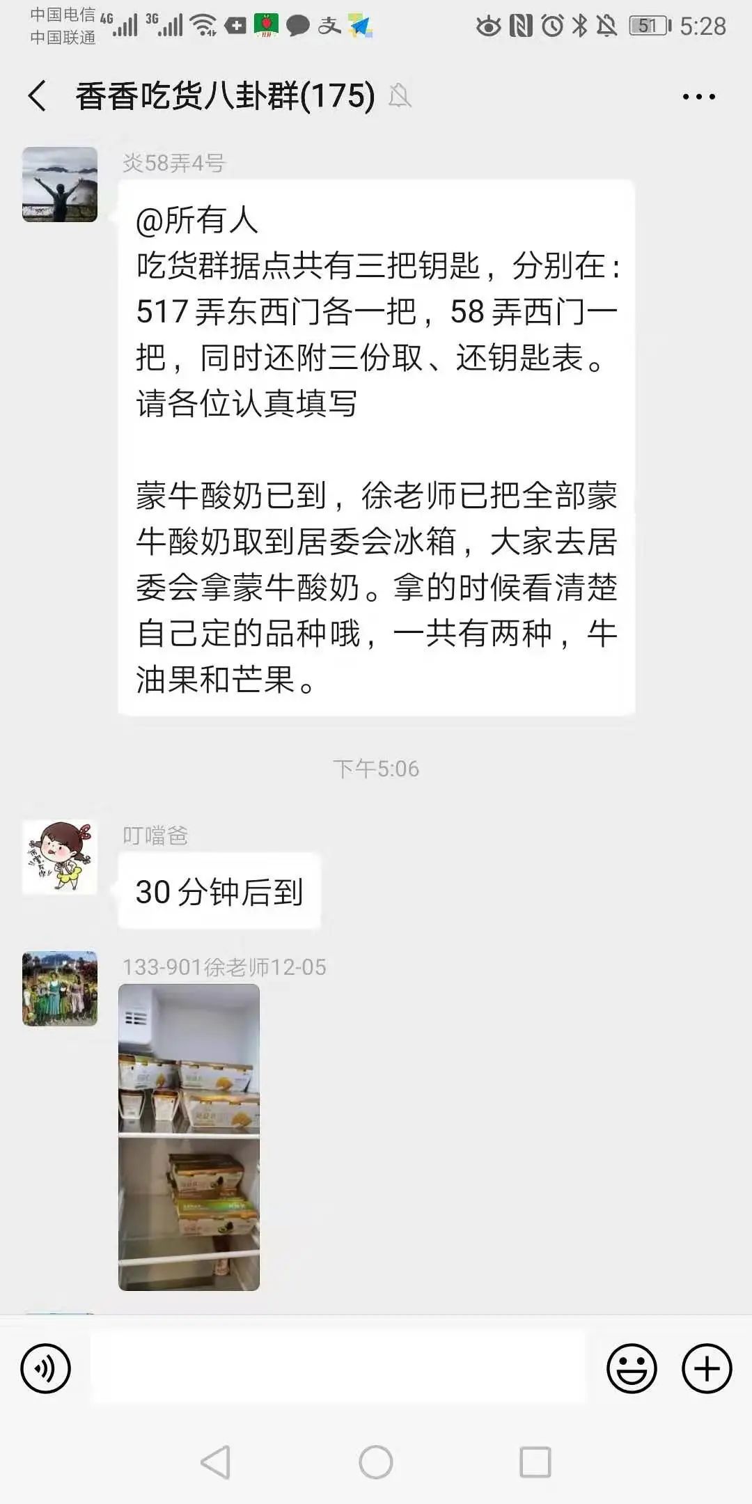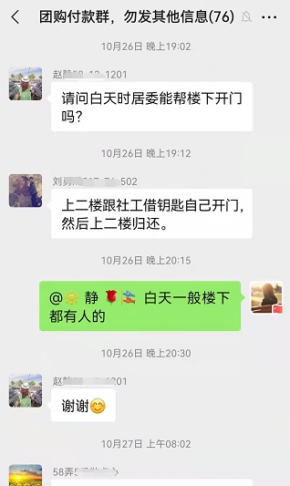 某日,宝山“社区通”平台上的一个求助信息引起了居委干部的注意。原来,香逸湾部分居民自发建立了一个 “香香吃货八卦”微信群,在群里大家抱团进行团购,如:到江阳市场团购海鲜、蔬菜等;到农村团购新鲜大米;到网上积分团购牛奶……