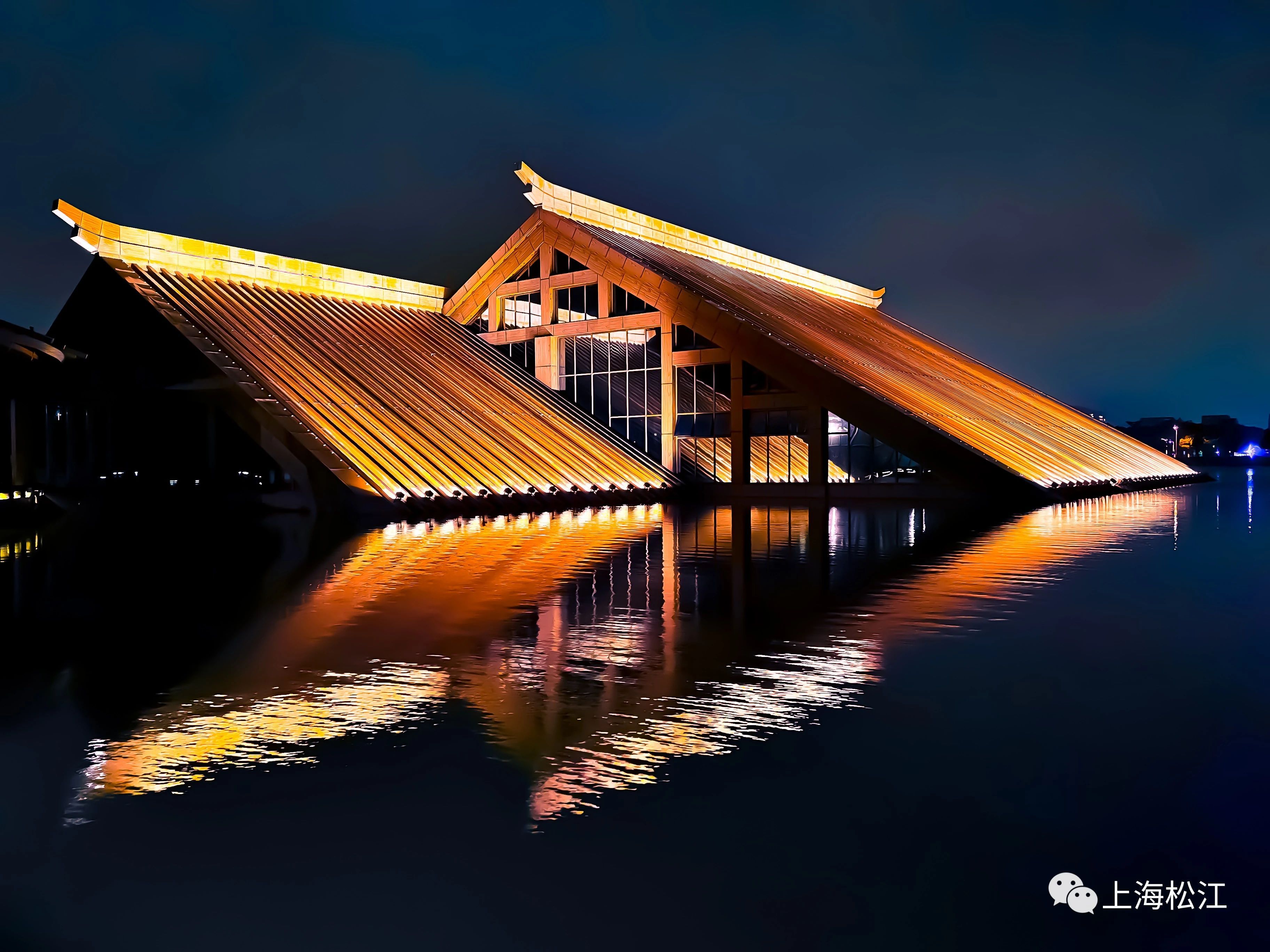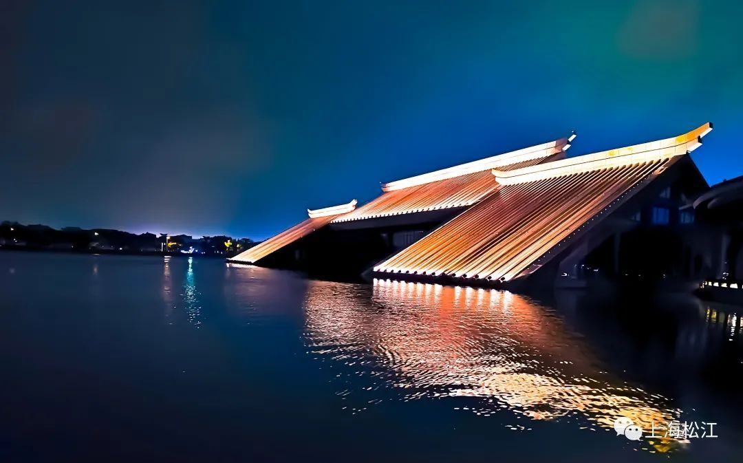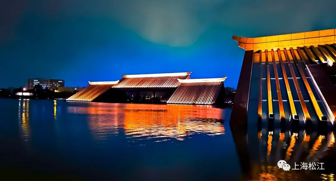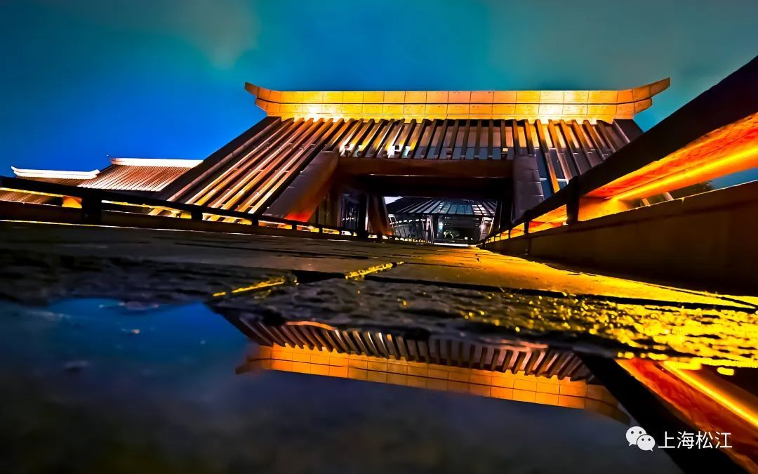 夜晚时分,广富林文化遗址内的水中世界更显绚丽,灯光在水面影影绰绰,将整个倒影装饰的如同油画一般。
