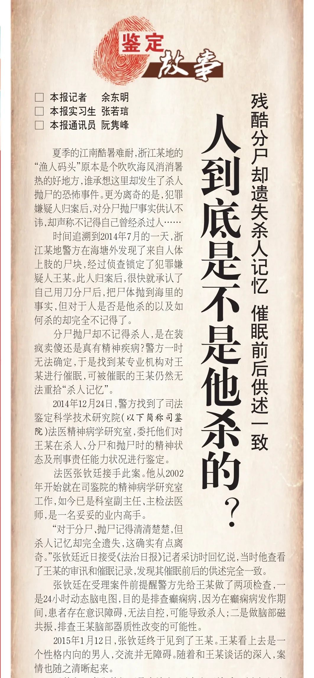 “对于分尸、抛尸记得清清楚楚,但杀人记忆却完全遗失,这确实有点离奇。”张钦廷近日接受《法治日报》记者采访时回忆说,当时他查看了王某的审讯和催眠记录,发现其催眠前后的供述完全一致。