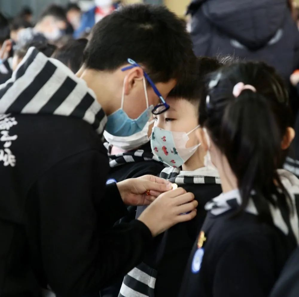 小辅导员为获章学生颁发佩戴“红星章”“火炬章”