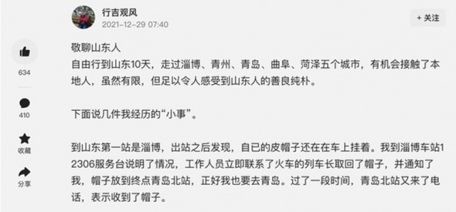 2021年12月29日,来自辽宁的退休教师孙老师发帖说,年底来山东旅游10天,遇到了好几件温暖的“小事”,让他感受到了山东人的善良淳朴。