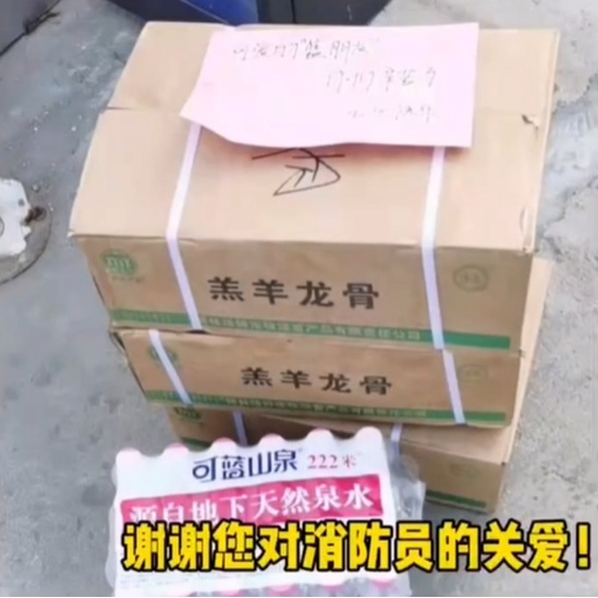 1月1日,青岛李沧区李村消防站收到三箱羊肉和一箱矿泉水,附带的字条上写着“可爱的‘蓝朋友’,你们辛苦了,元旦快乐”;