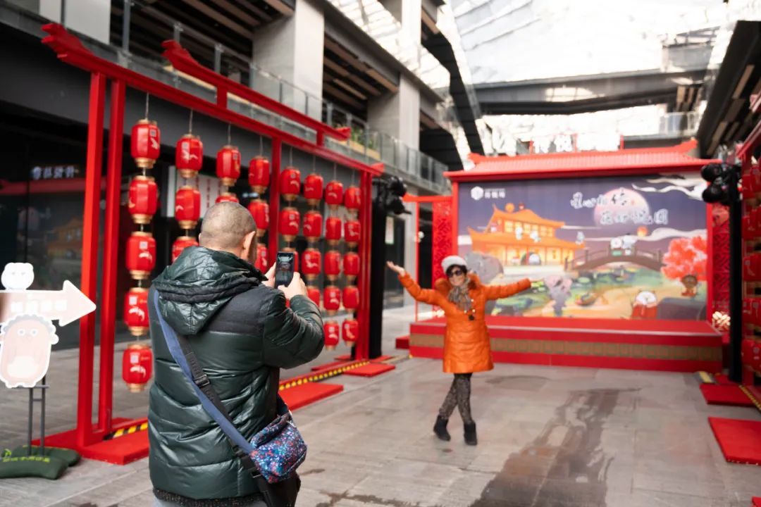 5个分别以“鱼跃龙门”、“锦绣前程”、“独占鳌头”、“金榜题名”、“临雍讲学”为名的打卡点位贯穿了整个商场的开放式街区。漫步在“弄堂”式的空间中,鲜明喜庆的国风元素结合上太学国子监祥瑞贴画,再与可爱的12星座娃娃碰擦出趣味十足的新火花,还有不少穿着汉服的年轻人来此打卡拍照,别有一番新年风味。没一会就吸引了众多过路市民拍照打卡。