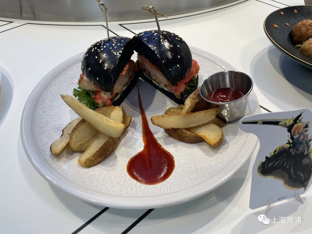 “斩击的瞬间月牙天冲堡”,取自《境・界BLEACH》中主角黑崎一护的绝招“月牙天冲”,不仅将汉堡直接“劈”成了两半,还用番茄酱留下了招式的印记,可谓创意十足。